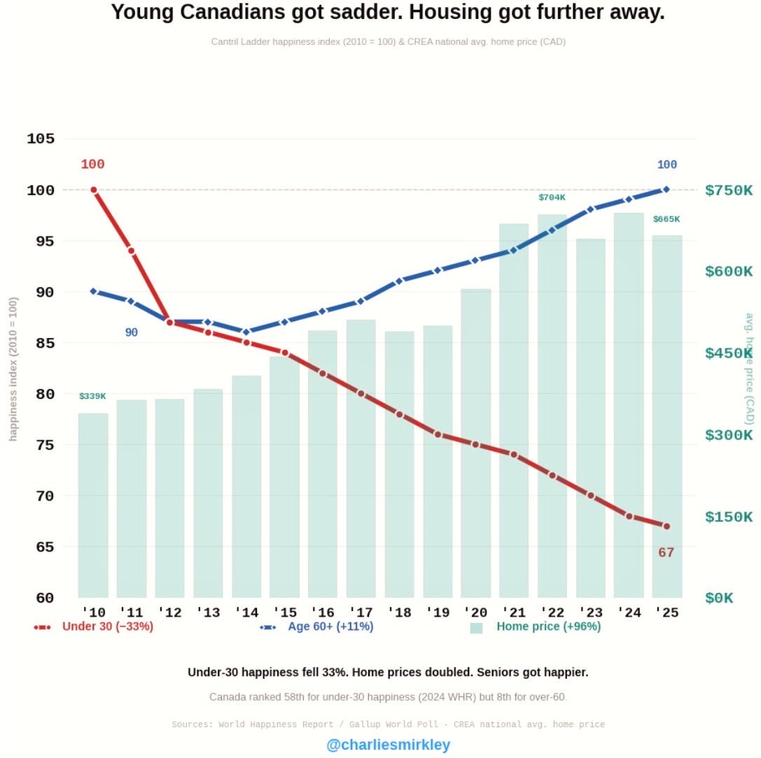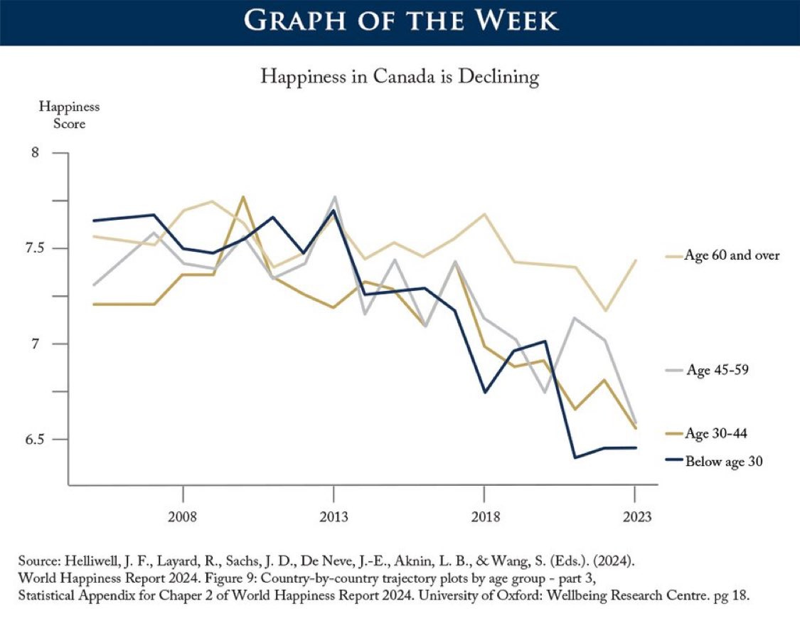Of the 3 countries that experienced a greater drop in happiness among young people than Canada, one is Malawi (with a poverty rate of 70%), and the other is Afghanistan.