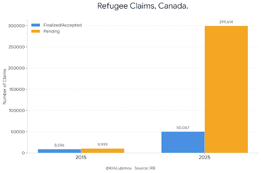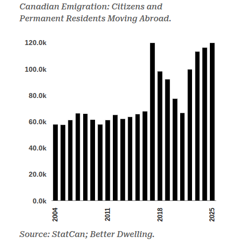 Emigration from Canada has doubled since the Liberals took office in 2015. This trend continued through 2025, marking the fourth consecutive year of Emigration growth, with a record 120,016 people leaving the country.