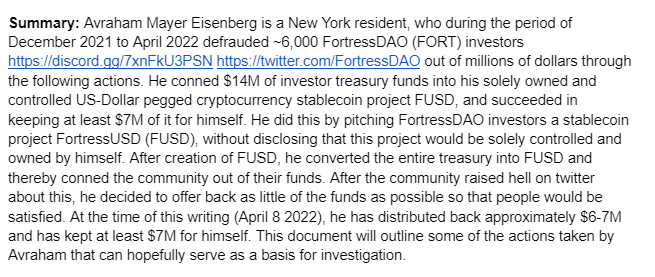I sent this paragraph directly to Avraham Eisenberg, and he responded to me, “The DAO overwhelmingly voted for converting the treasury into FUSD, and this was done after FUSD was launched and it was made clear that I was running the FUSD project. This can easily be seen from the timeline. The claim that it was done without approval is blatantly false. It's also false that I'm a NY resident.”