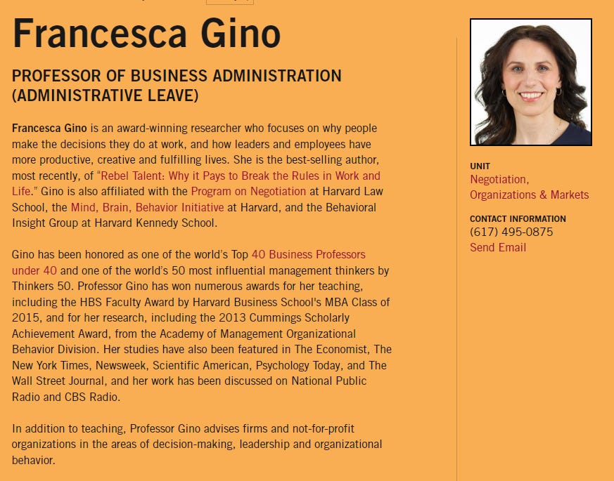 (1) As you can see on her Harvard home page (.htm), Gino has gone on "administrative leave", and the name of her chaired position at HBS is no longer listed.