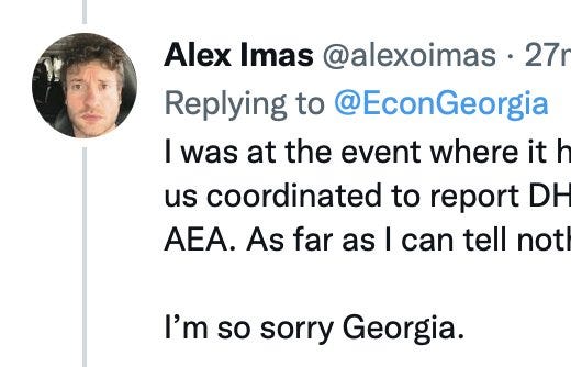 I've had probably a dozen different economists tell me off the record that they are disgusted by how Doleac is handling this, that it has clear witch hunt elements, etc. But say that publicly, and she will sic the mob on you.