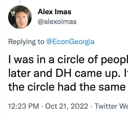2: Interesting about IHS being woke. I was active with them quite a bit up till 2018, and never really saw anything I would classify as woke at the time. A lot of effort to take econ away from being just abstractions and numbers and more humane, but nothing I would point to as woke. I am not saying you are wrong, a lot can change in 4 years, but just saying it would be a change.