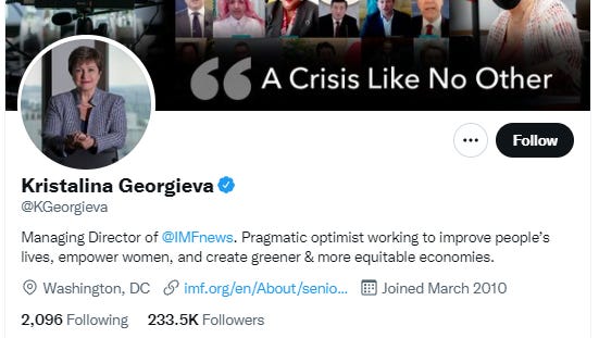 But it wasn’t just Africa who supported Georgieva. European powers widely supported her too, and without their backing she would be gone. I have my own theory for why they supported her: she has the right politics. Look no further than her twitter bio, which highlights green energy, feminism, and equity. She supports “equitable economies” so she *must* be a good person and a great leader:
