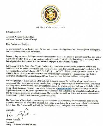 Following The Accounting Review’s retraction, Carnegie Mellon’s Office of Research Integrity and Compliance (ORIC) launched an investigation at the Provost’s request. ORIC found “no evidence of research misconduct,” reasoning that although the authors had “lost” their original data and code, they were able to privately “create a replication kit” that reproduced the results. They refused to release the alleged replication kit, preventing anyone from verifying this claim.