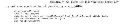 The following regression commands (exactly as in lines 51 and 52 of the Young (2018) code) produce analogous results using reconstructed May market capitalization rankings: