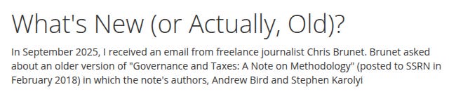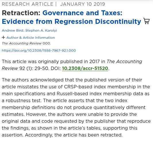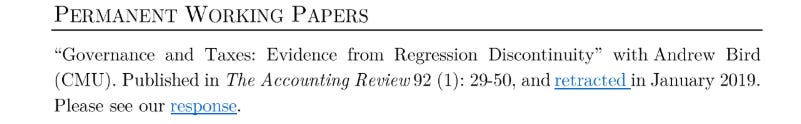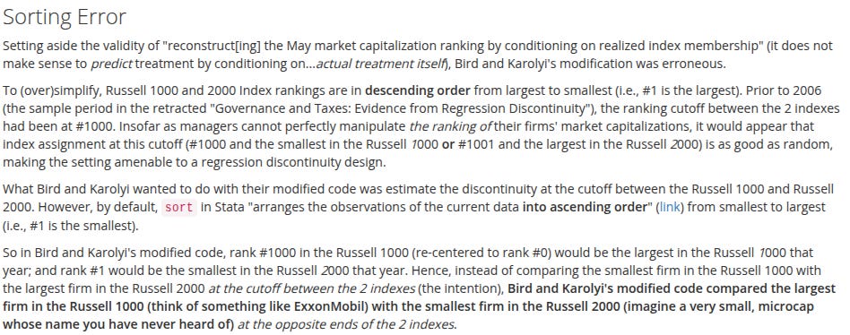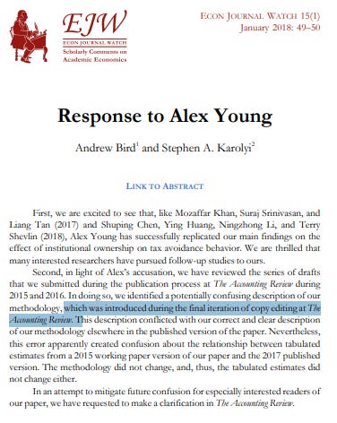 Nobody bought the ‘‘copy-editor’’ excuse, so, a month later, in February 2018, Bird and Karolyi published a (now deleted) 4-page note to SSRN titled, “Governance and Taxes: A Note on Methodology.” That note claimed that Alex Young did not correctly replicate their article: