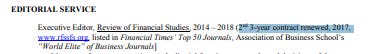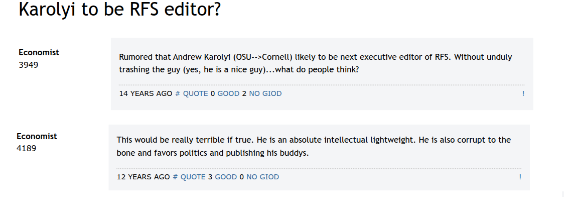 As for the elder Karolyi, who enabled his son’s fraud, his CV shows that he was renewed in 2017 for a second three-year term as an executive editor of the Review of Financial Studies. He “voluntarily” resigned from this position only one year into that term, in 2018, right as his son was put under investigation.