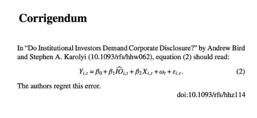 After being caught red-handed fabricating results in The Accounting Review, Bird and Karolyi were exposed a second time when a special committee appointed by the Review of Financial Studies — managed by Karolyi’s father, remember — investigated their paper, “Do Institutional Investors Demand Public Disclosure”, after ‘‘discovering inconsistencies between the published version and the earlier working paper.’’