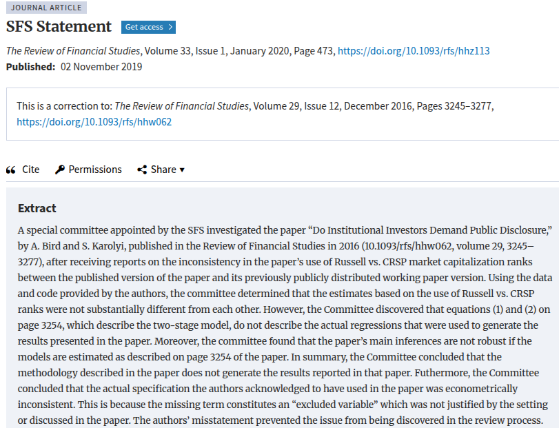 After Review of Financial Studies concluded that the same ‘‘error’’ happened a second time, they published a “Statement” concluding that: