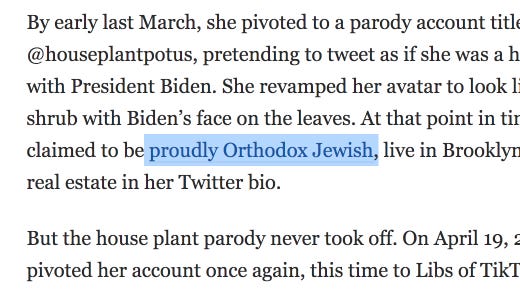 It is also worth reading this long & detailed thread about another time Lorenz engaged in journalistic malpractice, in which she tries to defame a Jewish guy as an anti-Semite while also strongly insinuating that he is not Jewish. That to me is the most twisted and Lorenzian part of it. She does the things normal liars and manipulators do and then there is often a Lorenzian twist - some gratuitous and evil flourish.