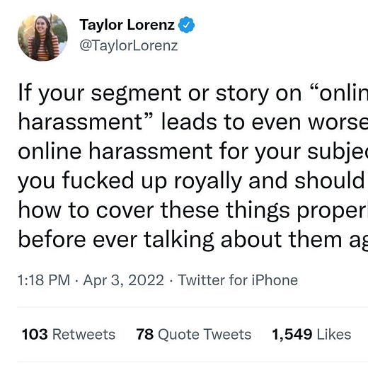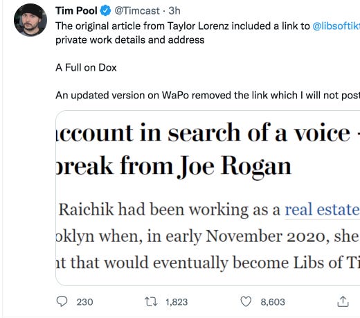 Sorry for the long preamble on Taylor Lorenz, but I felt it was necessary to flesh out her villain origin story so that you had the appropriate context for when I describe her next doxxing stunt.