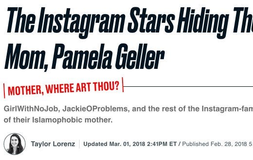 During the fatwah, Taylor Lorenz hunted down Geller’s four daughters on Instagram — who were not involved in any political activism — and doxxed them to the world in a scoop called The Instagram Stars Hiding Their Famous, Muslim-Hating Mom, Pamela Geller. There was no defensible reason for doxxing those Jewish teenagers to ISIS. Unless, of course, you hate Jews.