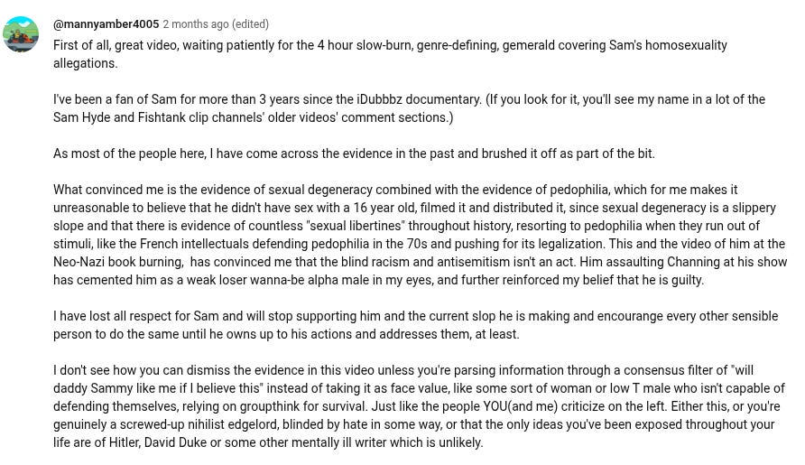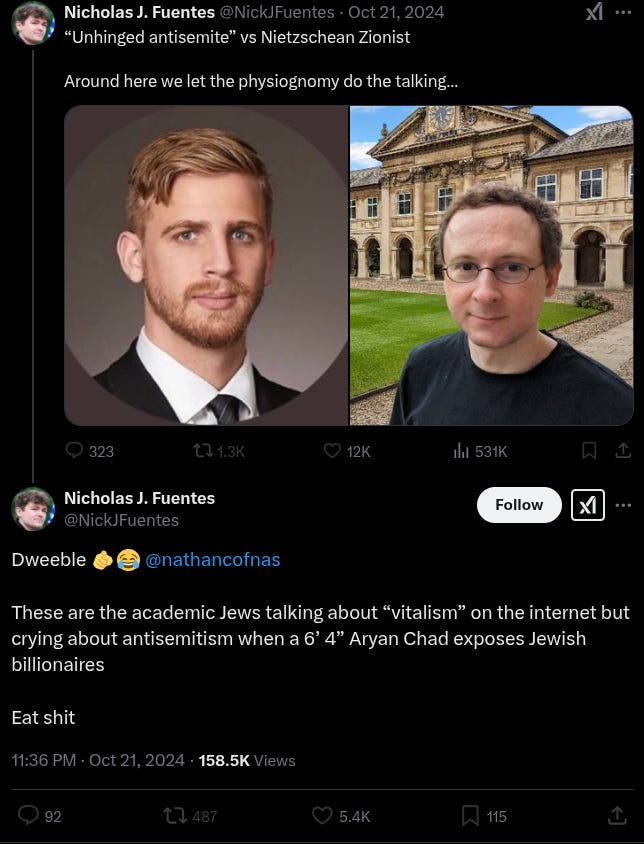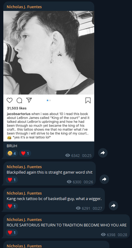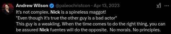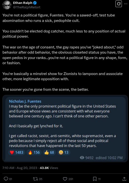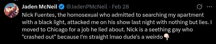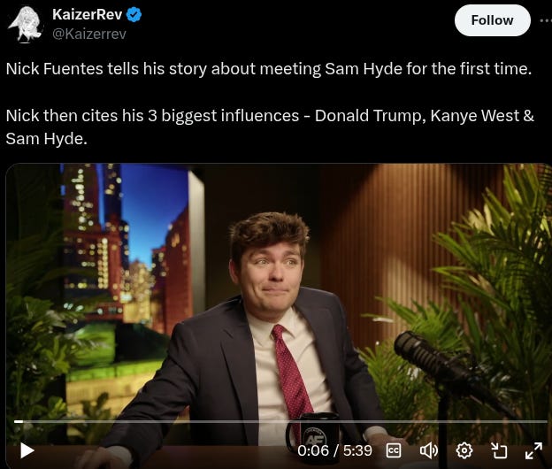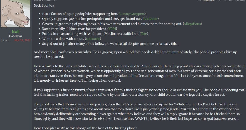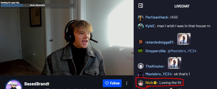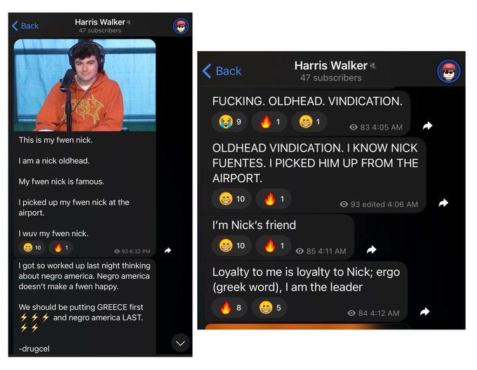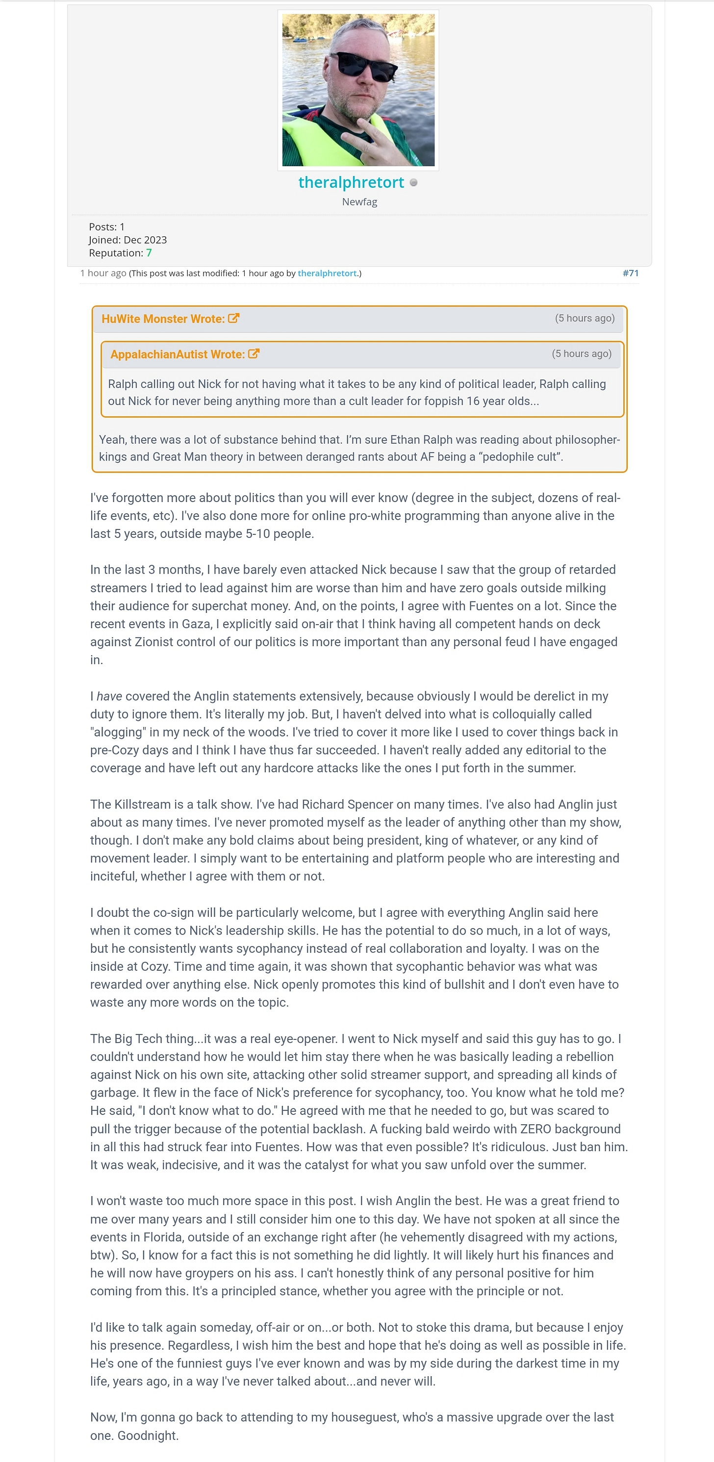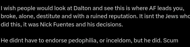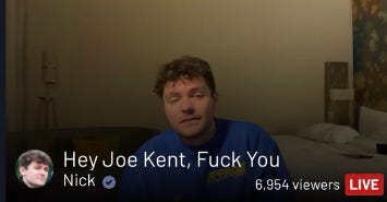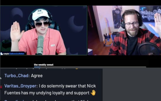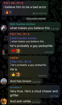 It makes me extremely sad to see more young boys jump on his movement and repeat his lies, even though it’s going to fuck up their lives, just like that one kid that took advice from Nick Fuentes. And I feel kind of powerless to stop that, to help people who I know are going to get fucked over by trusting this federal fucking asset, this traitor—this traitor who has committed treason against his own people, his own fucking supporter base, never mind his movements or his race or his country. He’s committed the worst thing you could: he knew he sold out his own people, the people that still fucking listen to him and have listened to him for years.’’