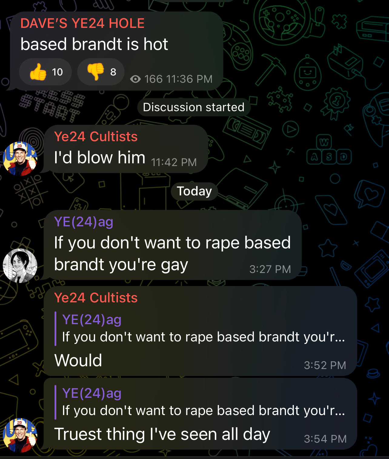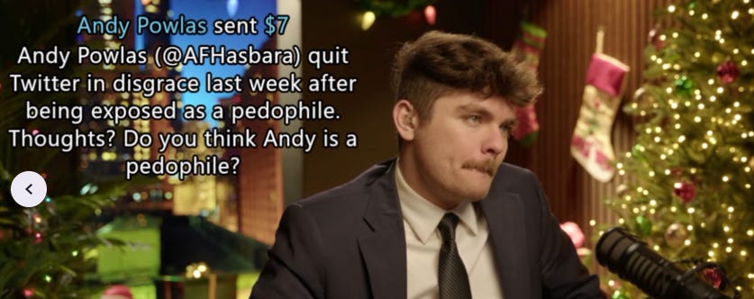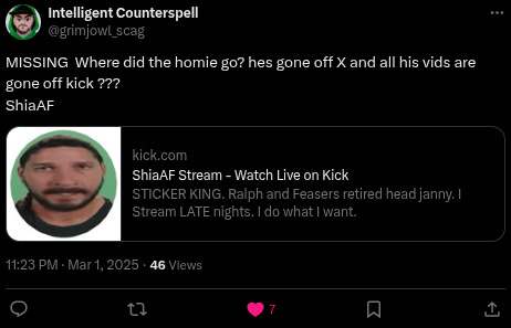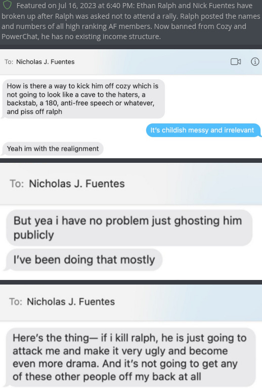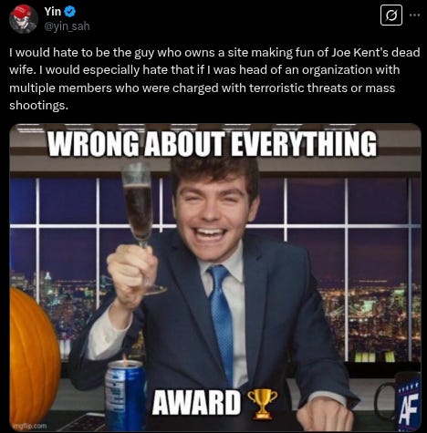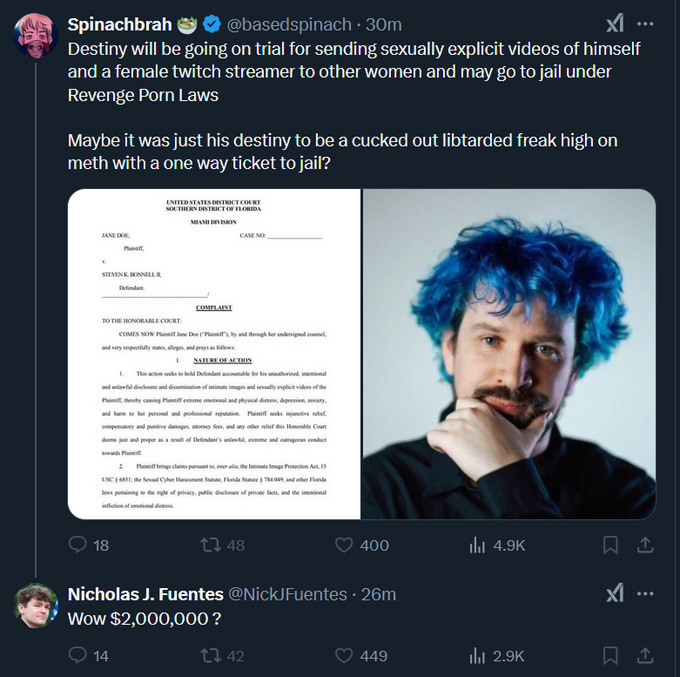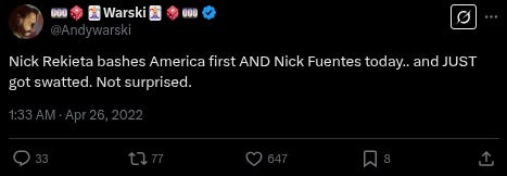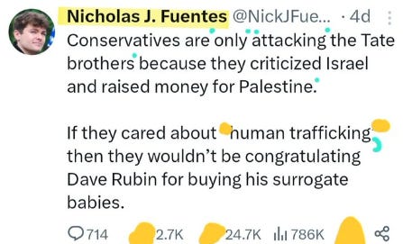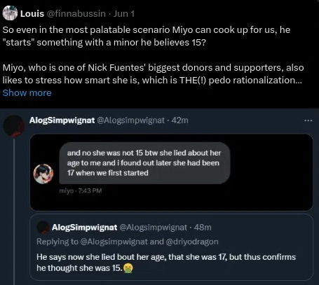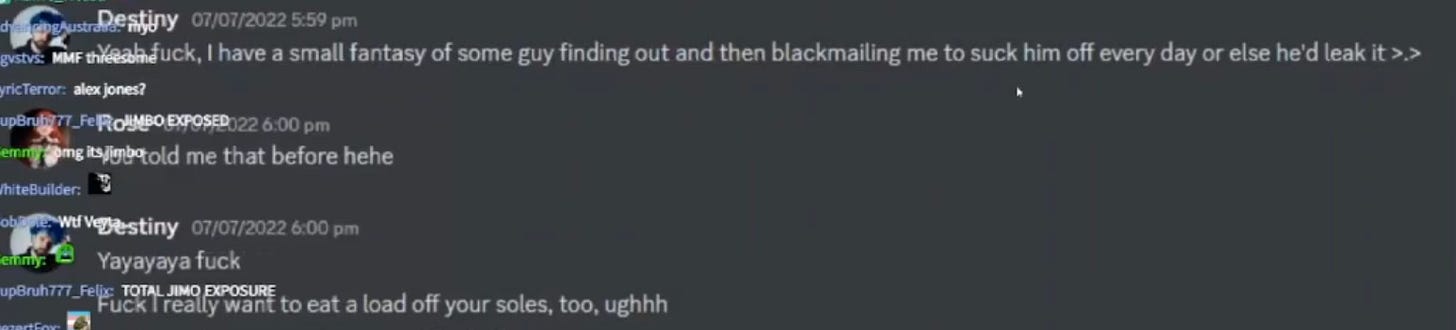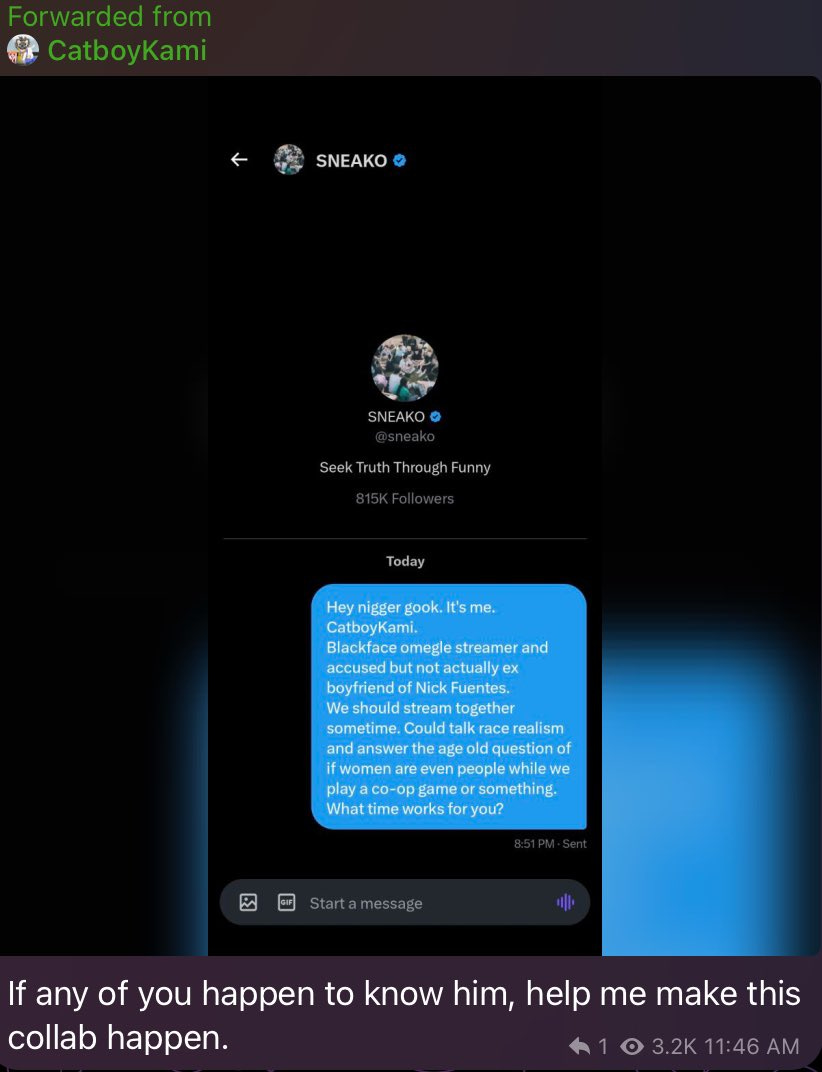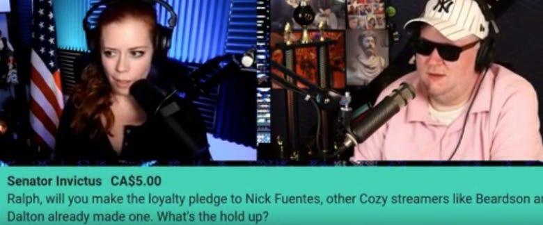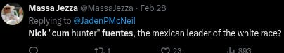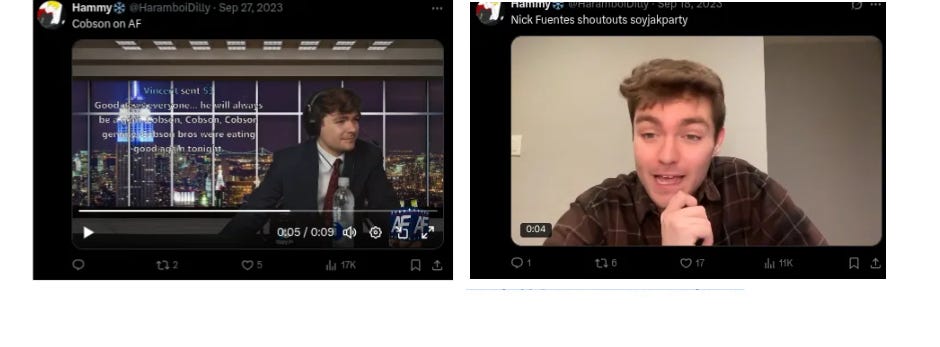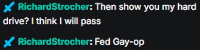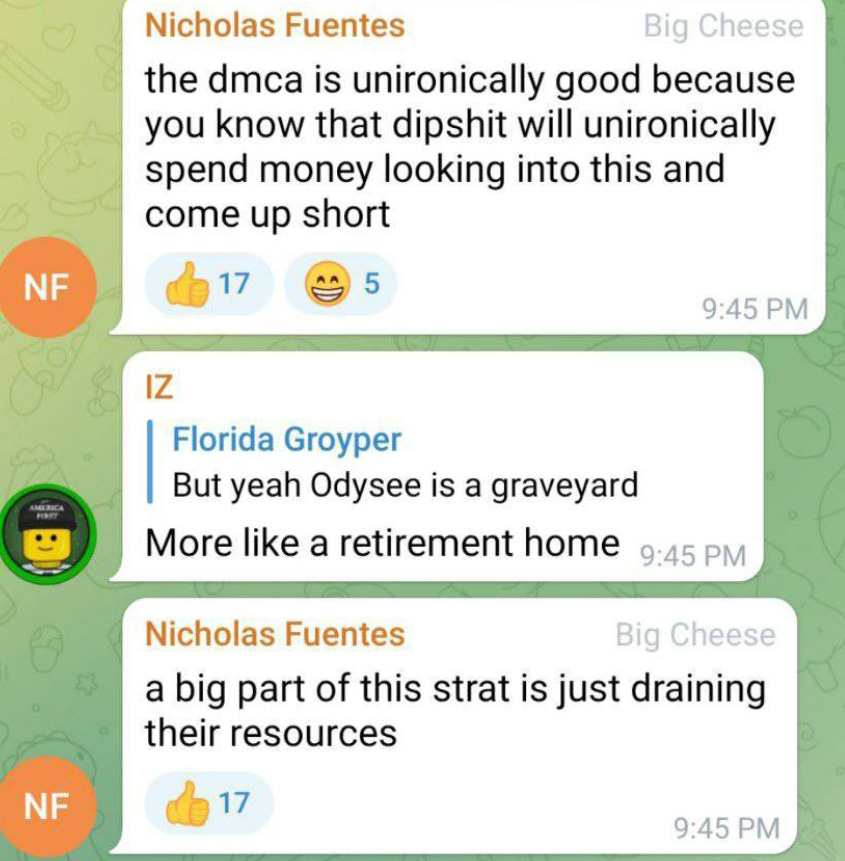 It makes me extremely sad to see more young boys jump on his movement and repeat his lies, even though it’s going to fuck up their lives, just like that one kid that took advice from Nick Fuentes. And I feel kind of powerless to stop that, to help people who I know are going to get fucked over by trusting this federal fucking asset, this traitor—this traitor who has committed treason against his own people, his own fucking supporter base, never mind his movements or his race or his country. He’s committed the worst thing you could: he knew he sold out his own people, the people that still fucking listen to him and have listened to him for years.’’