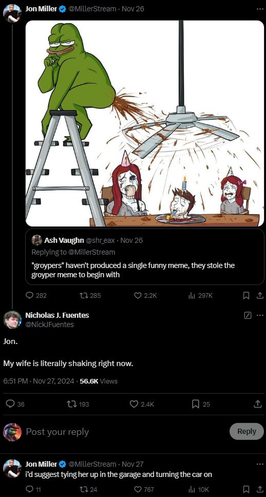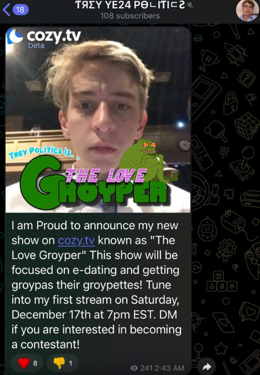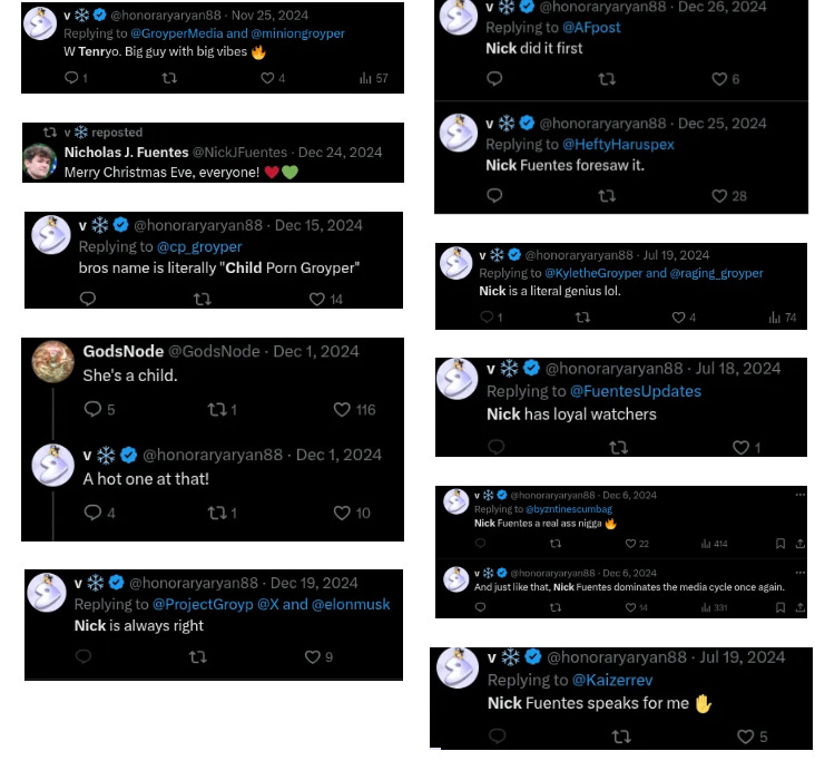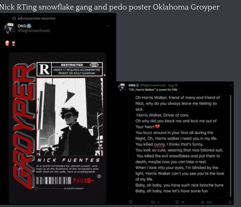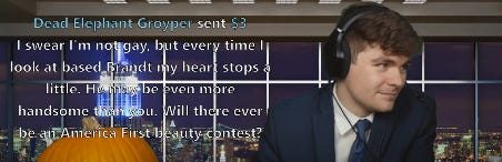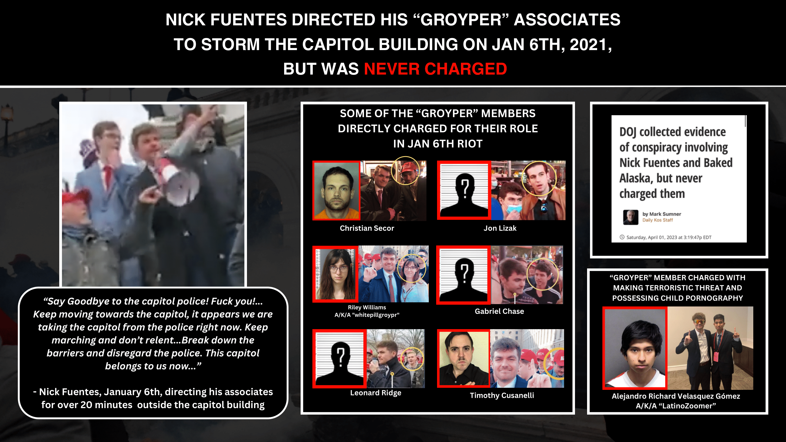This 33,000-word exposé is the most in-depth investigation ever conducted into Nick Fuentes’ media empire. It draws on leaks, public records, and interviews with ex-girlfriends, ex-employees, streamers, FBI informants, catboys, police chiefs, and a Catholic priest, to uncover 50 interconnected Groyper scandals ranging from grooming, child pornography, revenge pornography, and pedophilia to swatting, doxxing, drug trafficking, crypto scams, tax fraud, rape, brainwashing, mental illness, mass shootings, election interference, foreign interference, and domestic terrorism. The Groypers operate like a cult, targeting young conservatives grappling with autism, trauma, or sexual identity, and grooming them into unwavering loyalty to wealthy, older gay men who exploit them for sexual gain, blackmail, and kompromat.