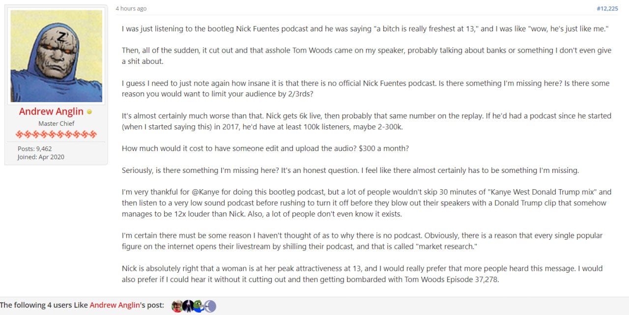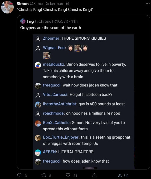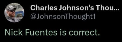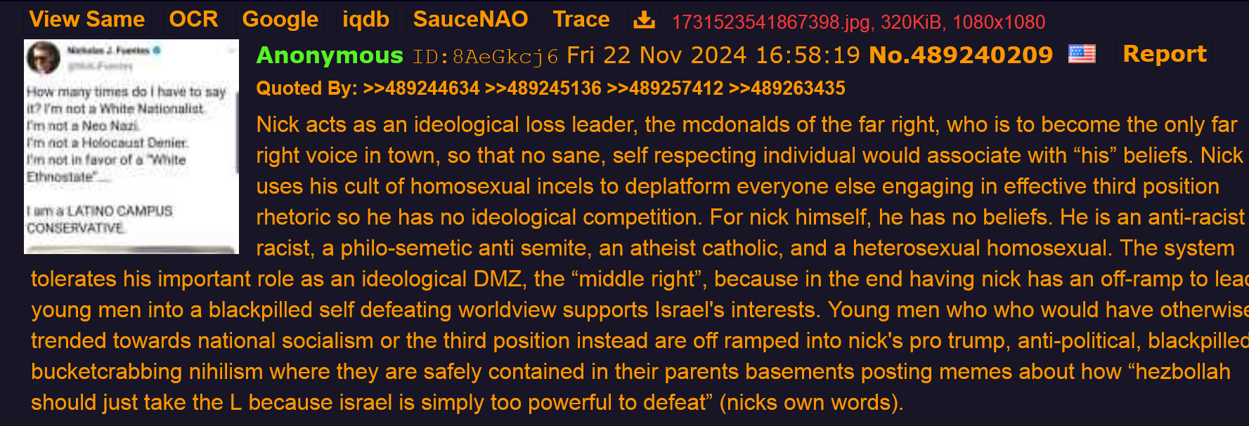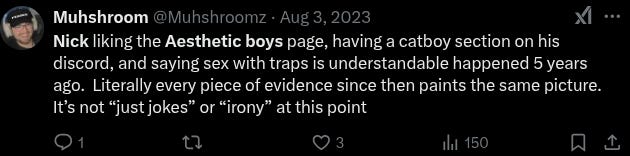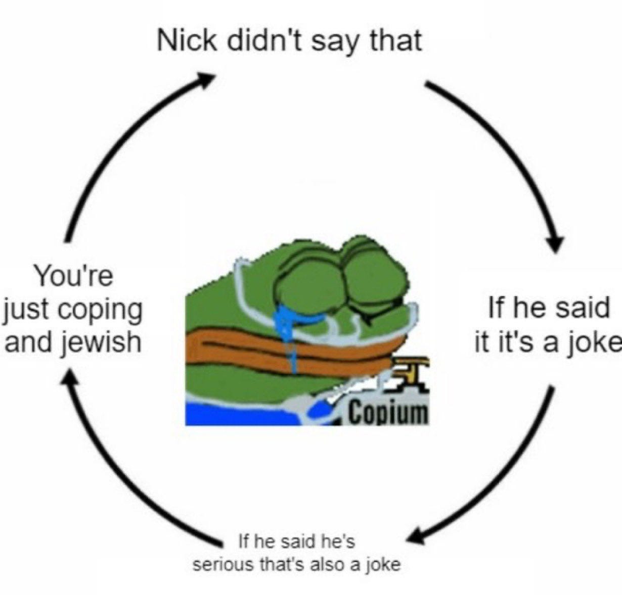 Glad I followed my instincts on being a groyper. From my very brief exposure to Nick's content, it seemed fine, but when I followed him my algorithm on Twitter was ruined with pedos, tranny's, and people just saying disgusting things (listen, my views on race are highly unorthodox, but at some point you're just saying something evil). I blocked the weird accounts, eventually stopped using Twitter altogether for unrelated reasons and mostly ignored groyperism in favor of higher quality dissident right wing content.