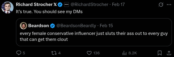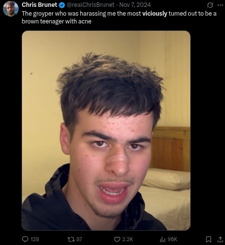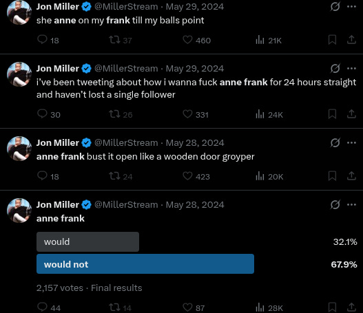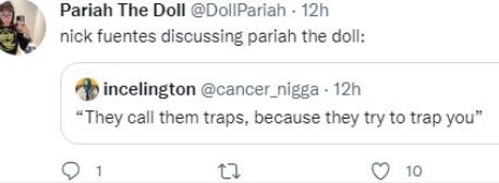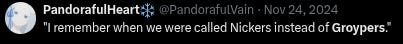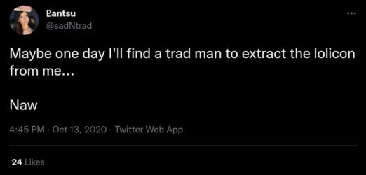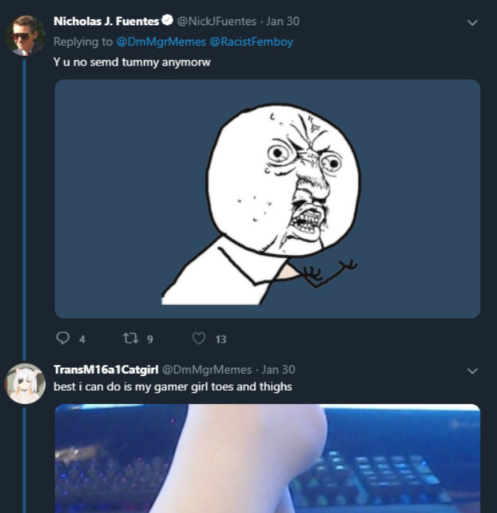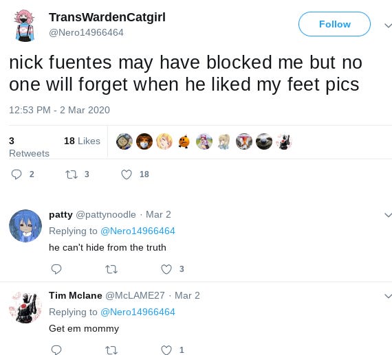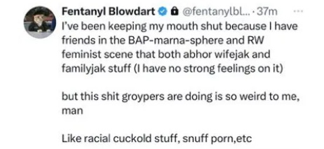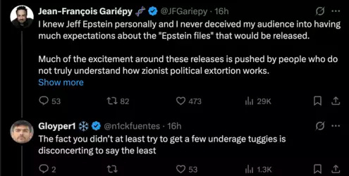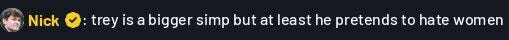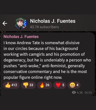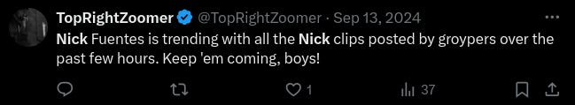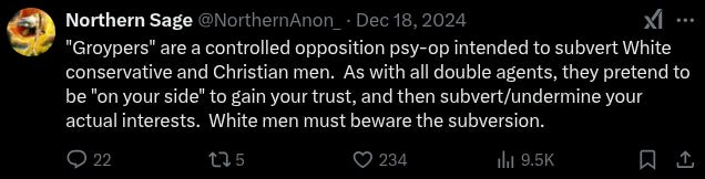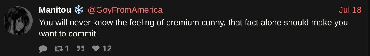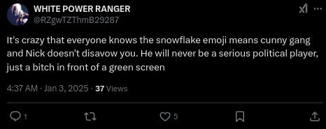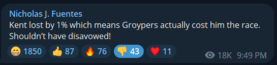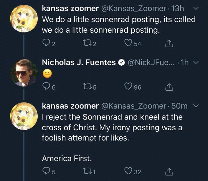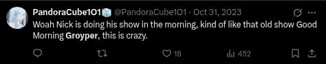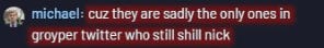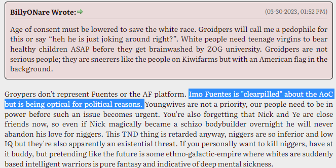 Glad I followed my instincts on being a groyper. From my very brief exposure to Nick's content, it seemed fine, but when I followed him my algorithm on Twitter was ruined with pedos, tranny's, and people just saying disgusting things (listen, my views on race are highly unorthodox, but at some point you're just saying something evil). I blocked the weird accounts, eventually stopped using Twitter altogether for unrelated reasons and mostly ignored groyperism in favor of higher quality dissident right wing content.