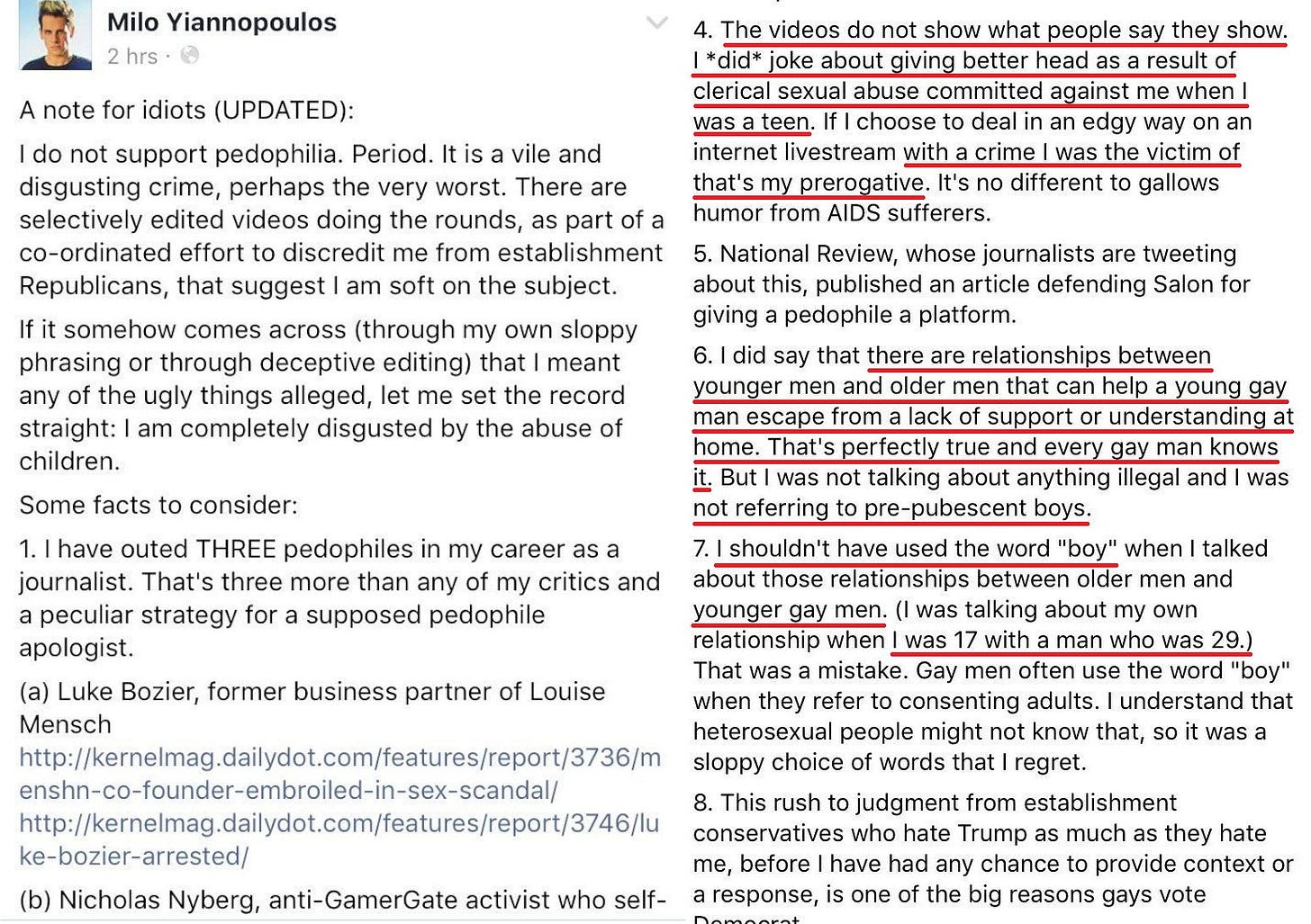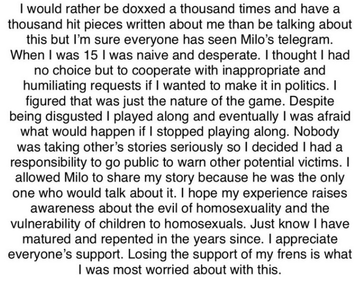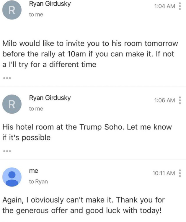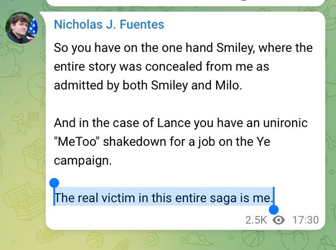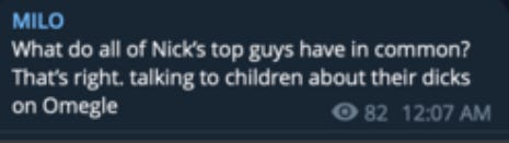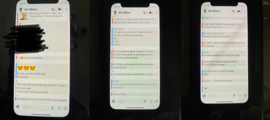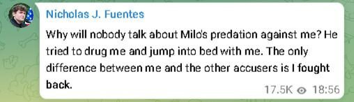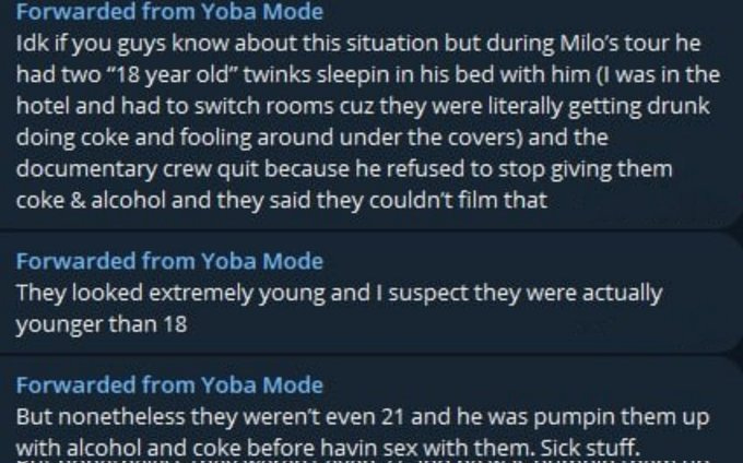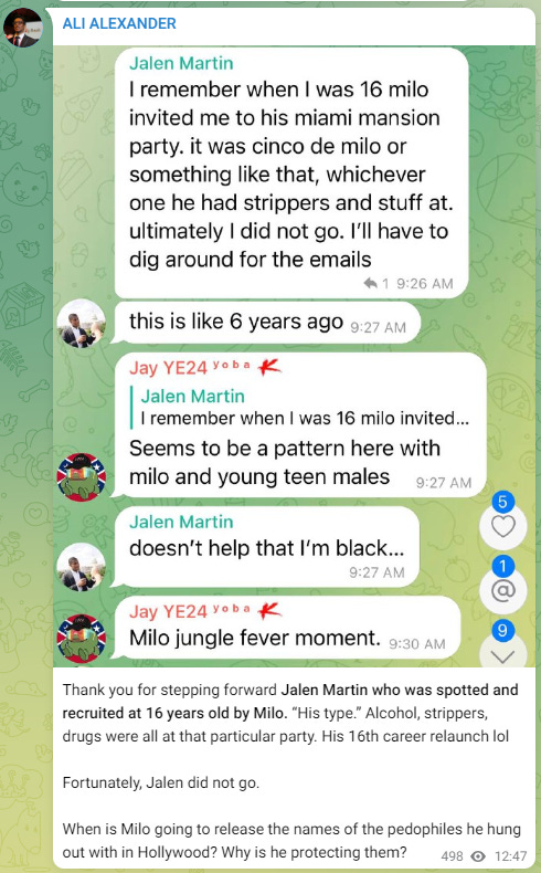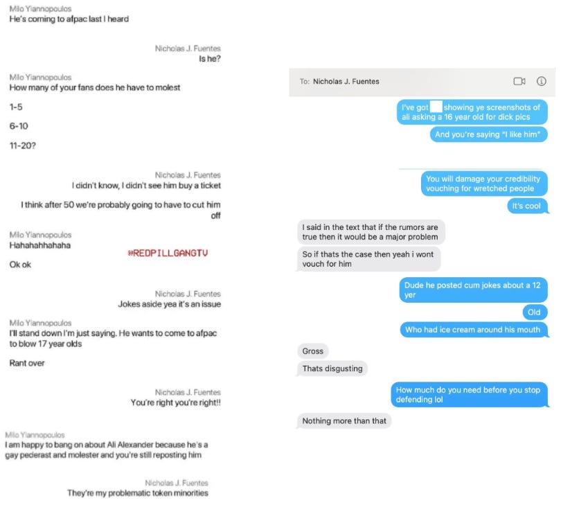 Milo released texts between him and Nick: ‘‘How many of your fans does he have to molest [Ali Alexander] just wanted to come to [your conference] to blow 17 year olds?’’ to which Nick replied: ‘‘You’re right you’re right!!! … they’re my problematic token minorities.’'