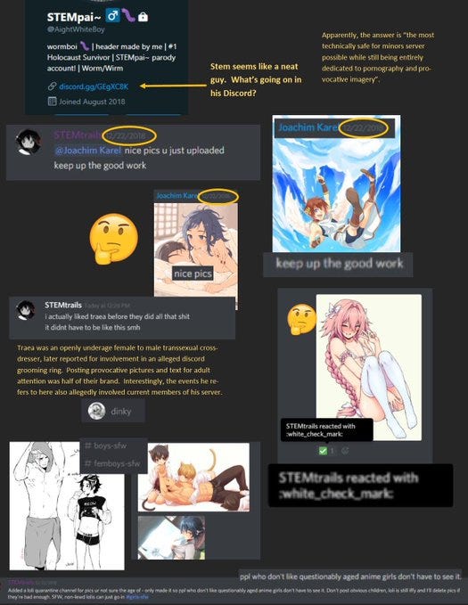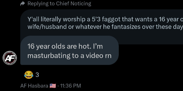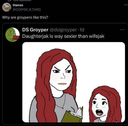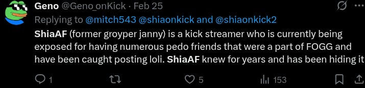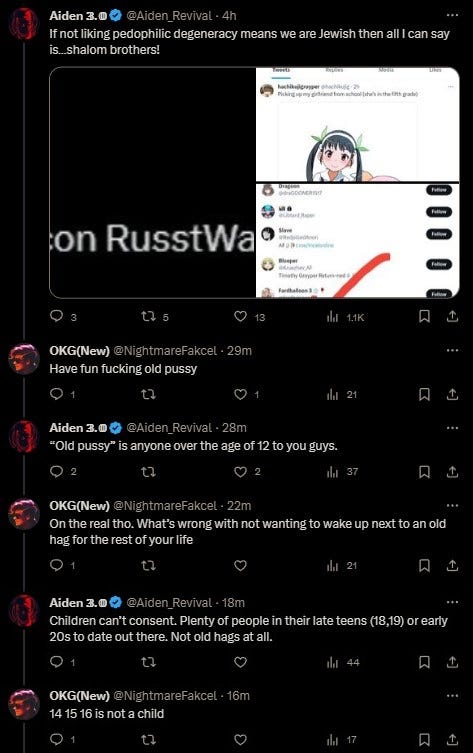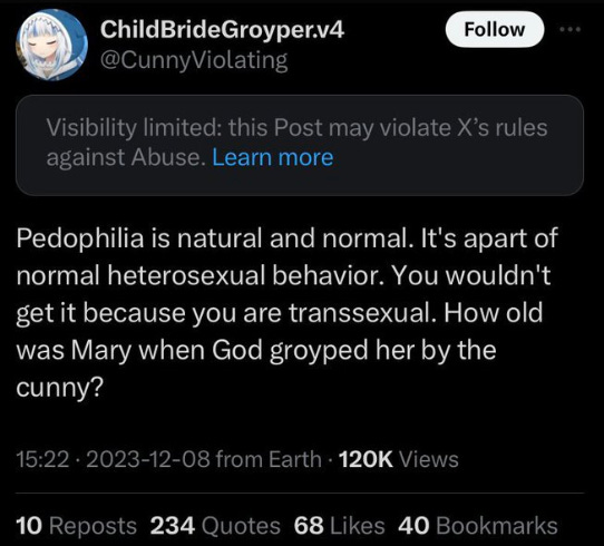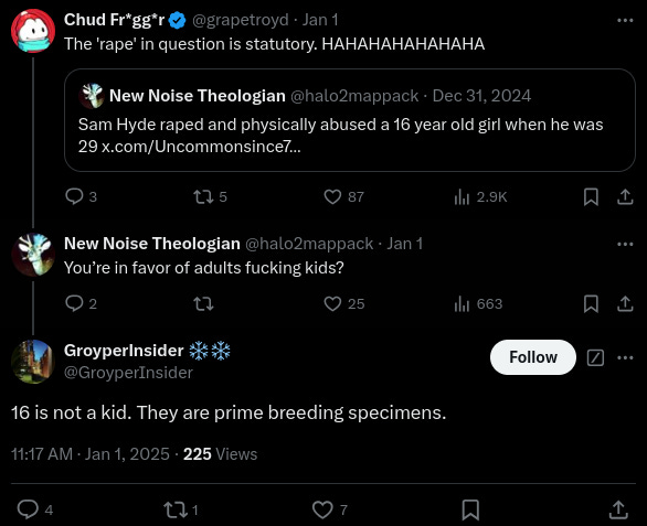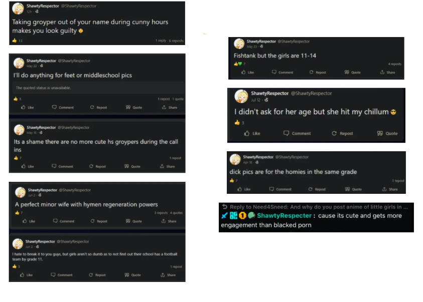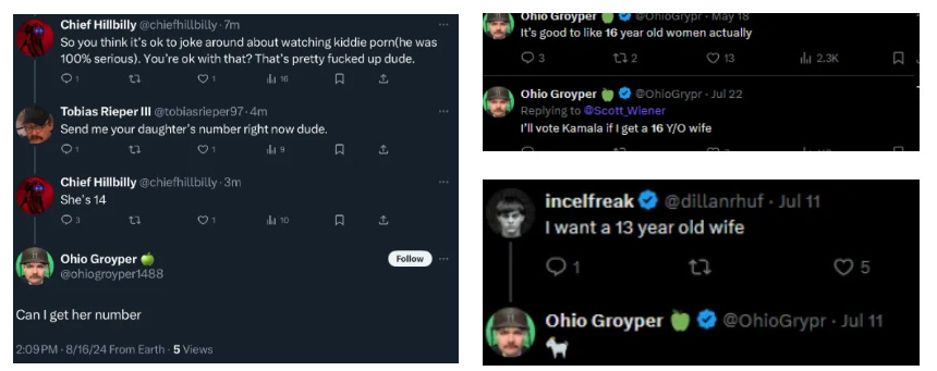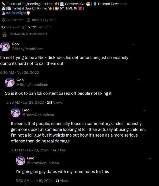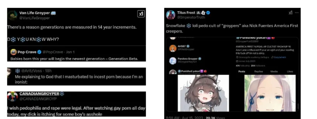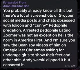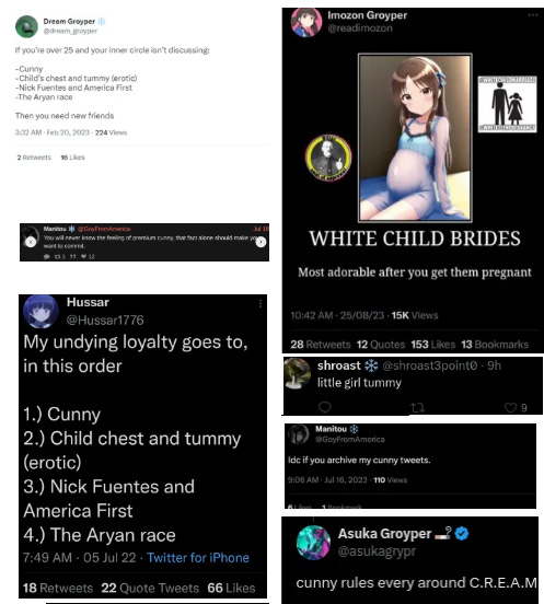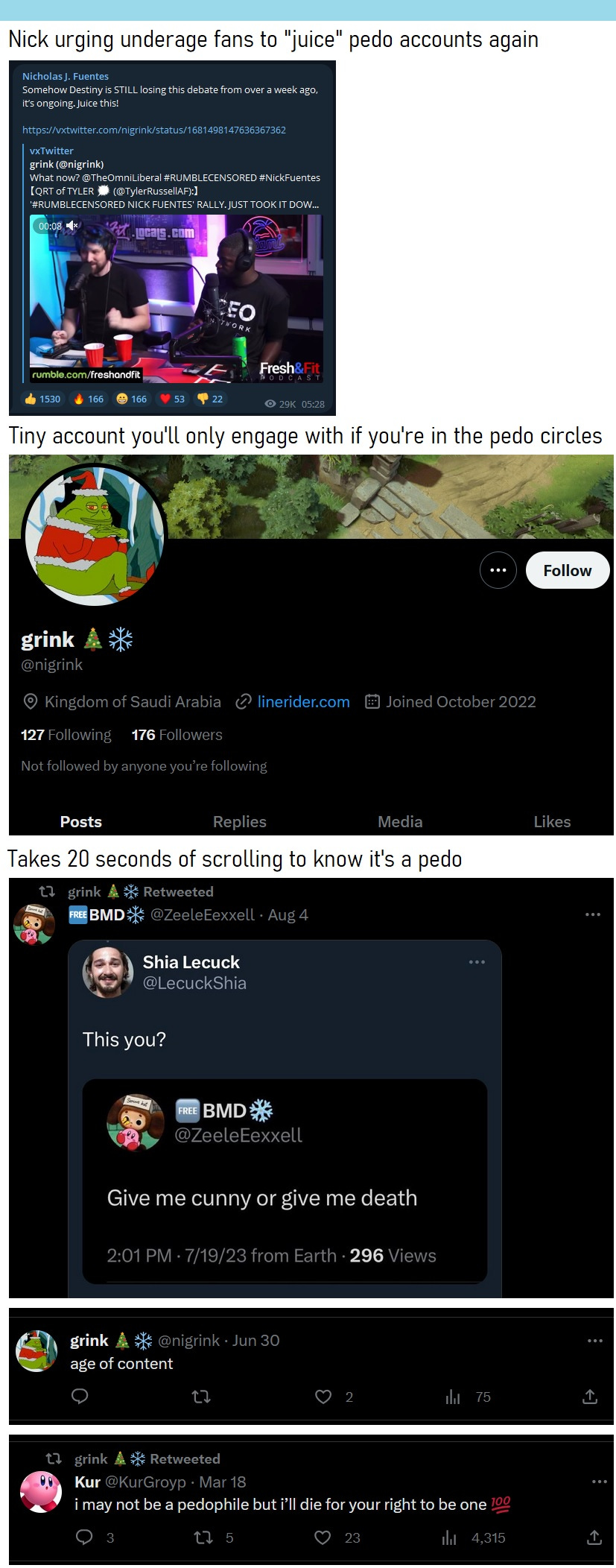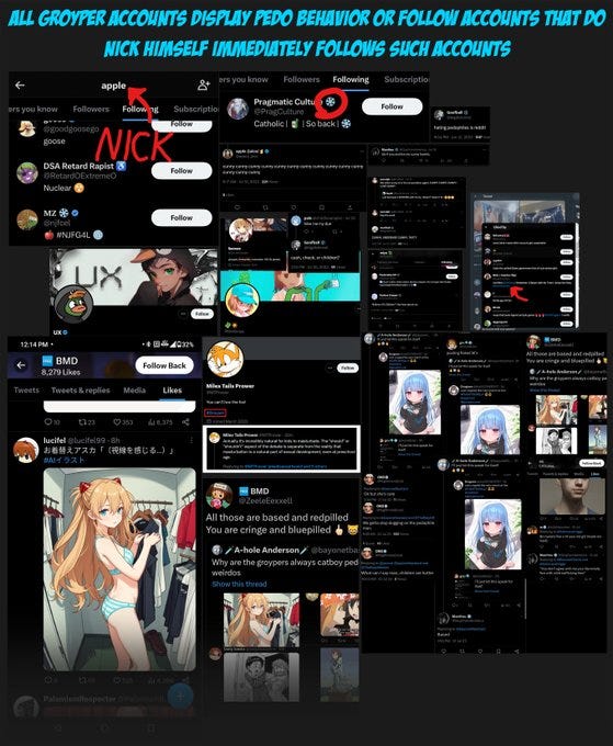 ‘‘Groyper pedo accounts are incredibly easy to find because they all like each other, follow each other, and promote each other. When they get banned for posting about lolicon and wanting to fuck kids, they make new accounts and re-tweet each other to retain their followers. That's why these accounts have hundreds of followers at a minimum and often 1000+. They are plugged into AF, they communicate on Telegram/Discord off-site, and promote each other.’’