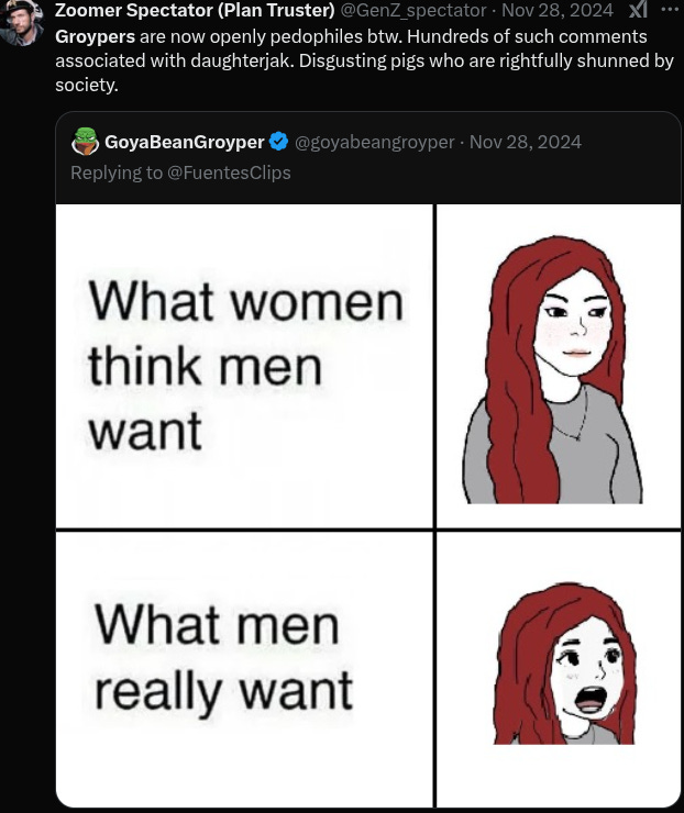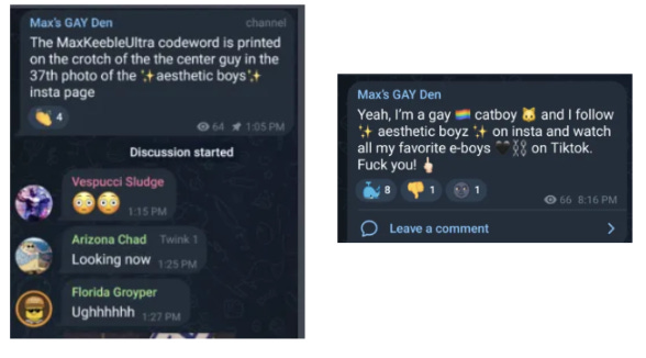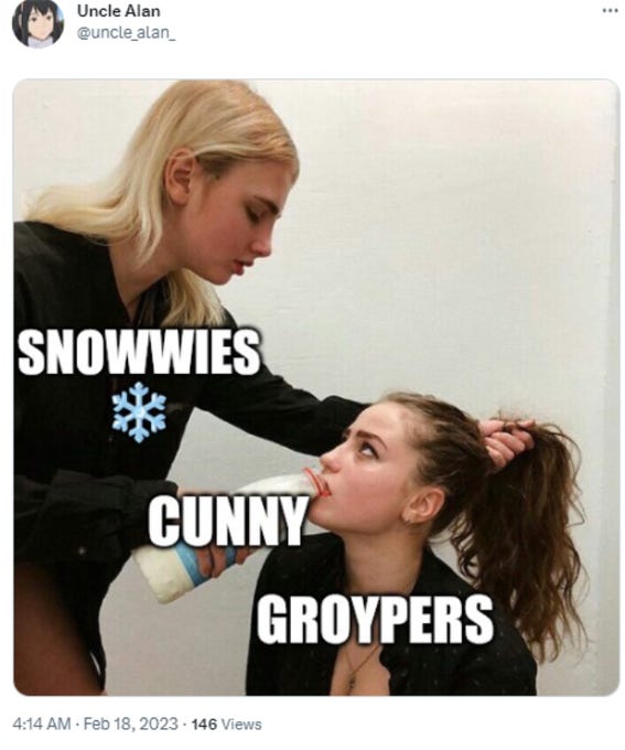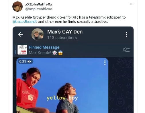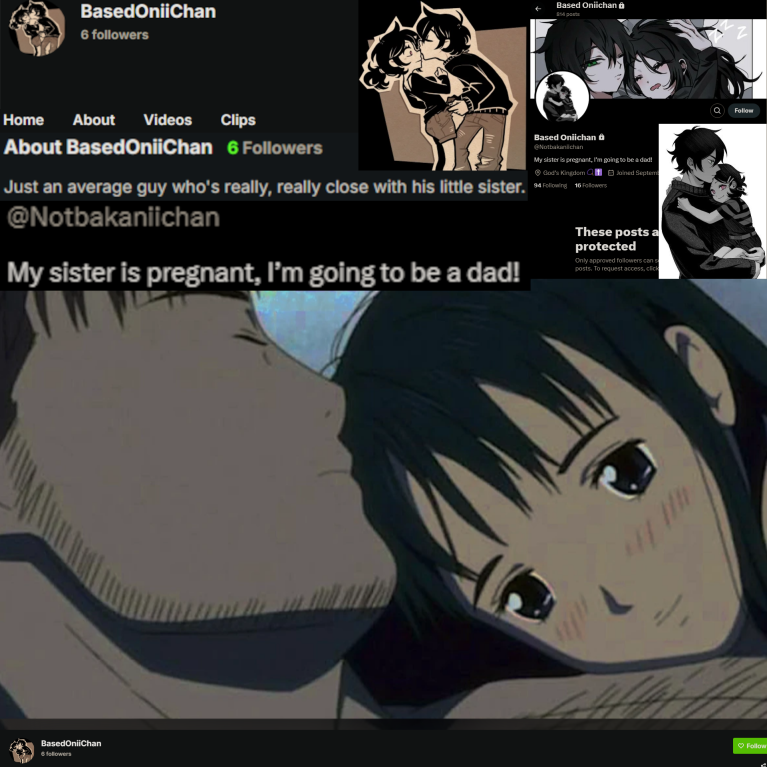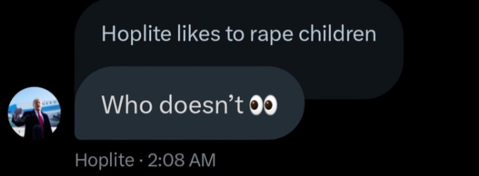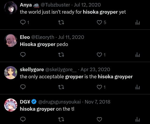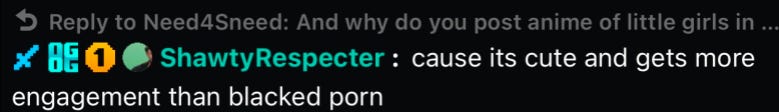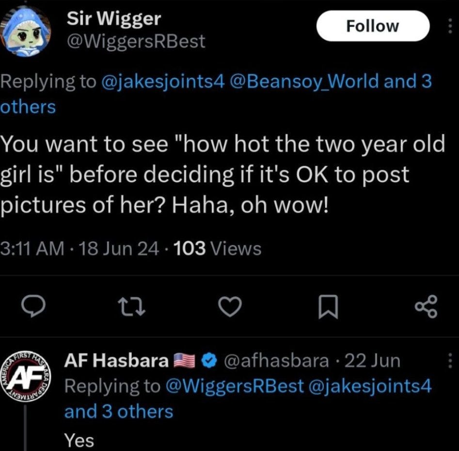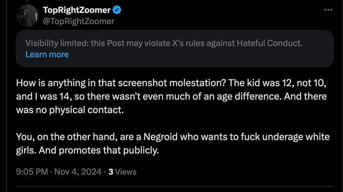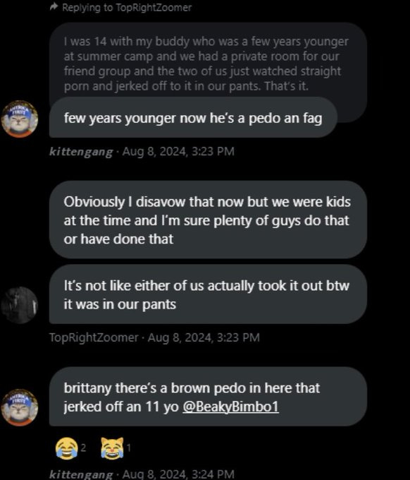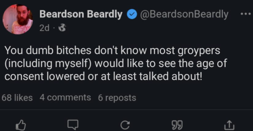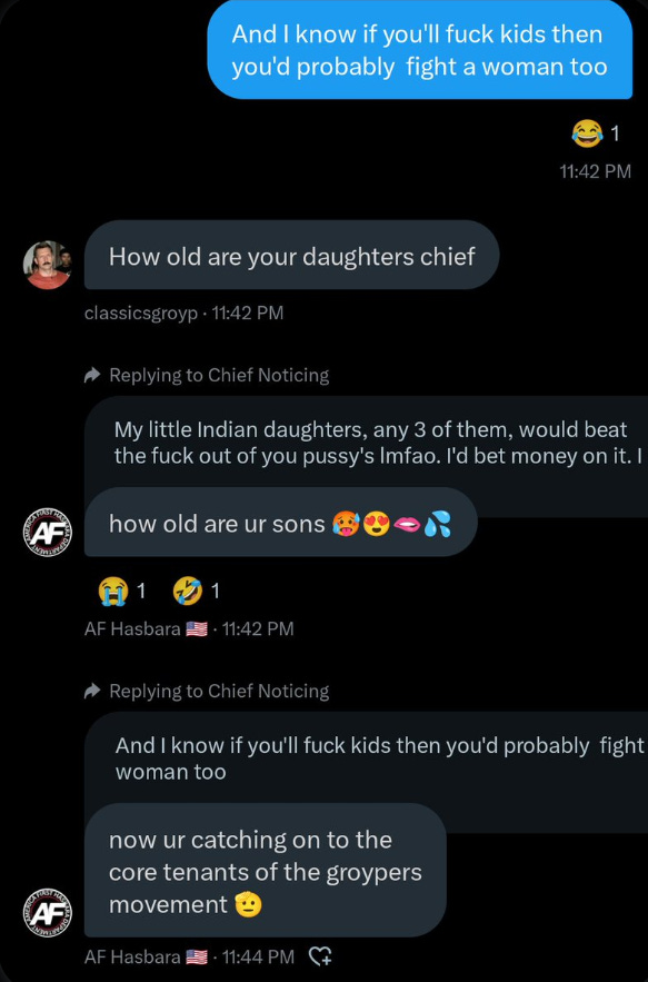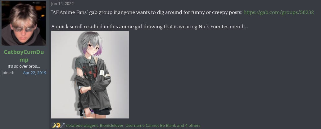 ‘‘Groyper pedo accounts are incredibly easy to find because they all like each other, follow each other, and promote each other. When they get banned for posting about lolicon and wanting to fuck kids, they make new accounts and re-tweet each other to retain their followers. That's why these accounts have hundreds of followers at a minimum and often 1000+. They are plugged into AF, they communicate on Telegram/Discord off-site, and promote each other.’’