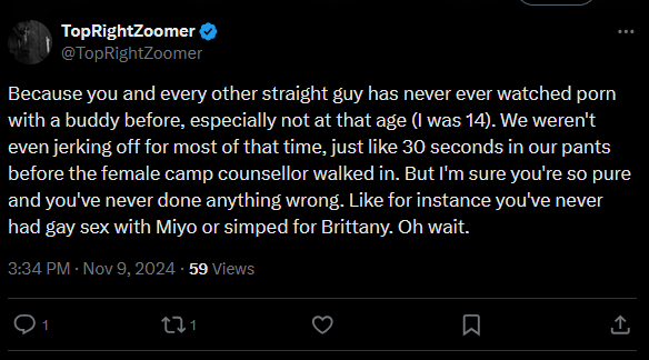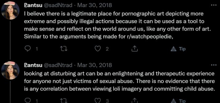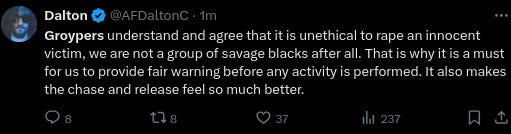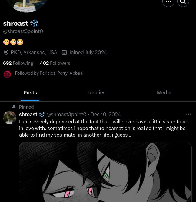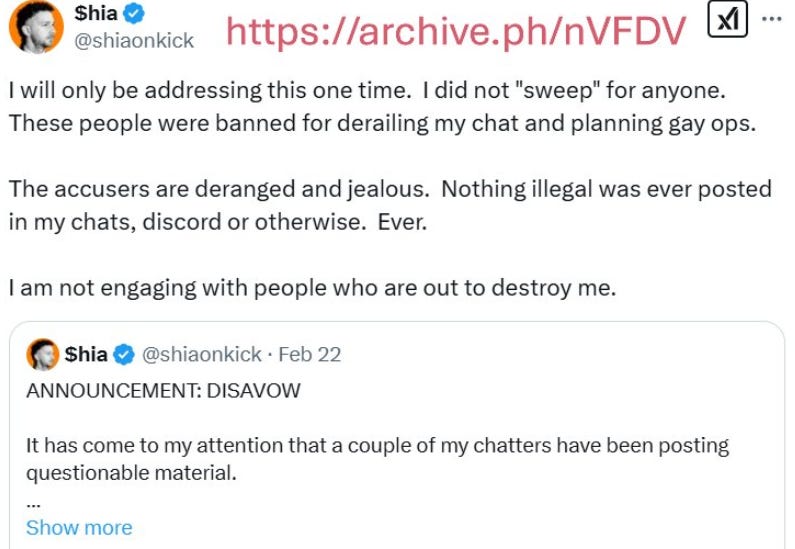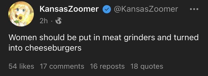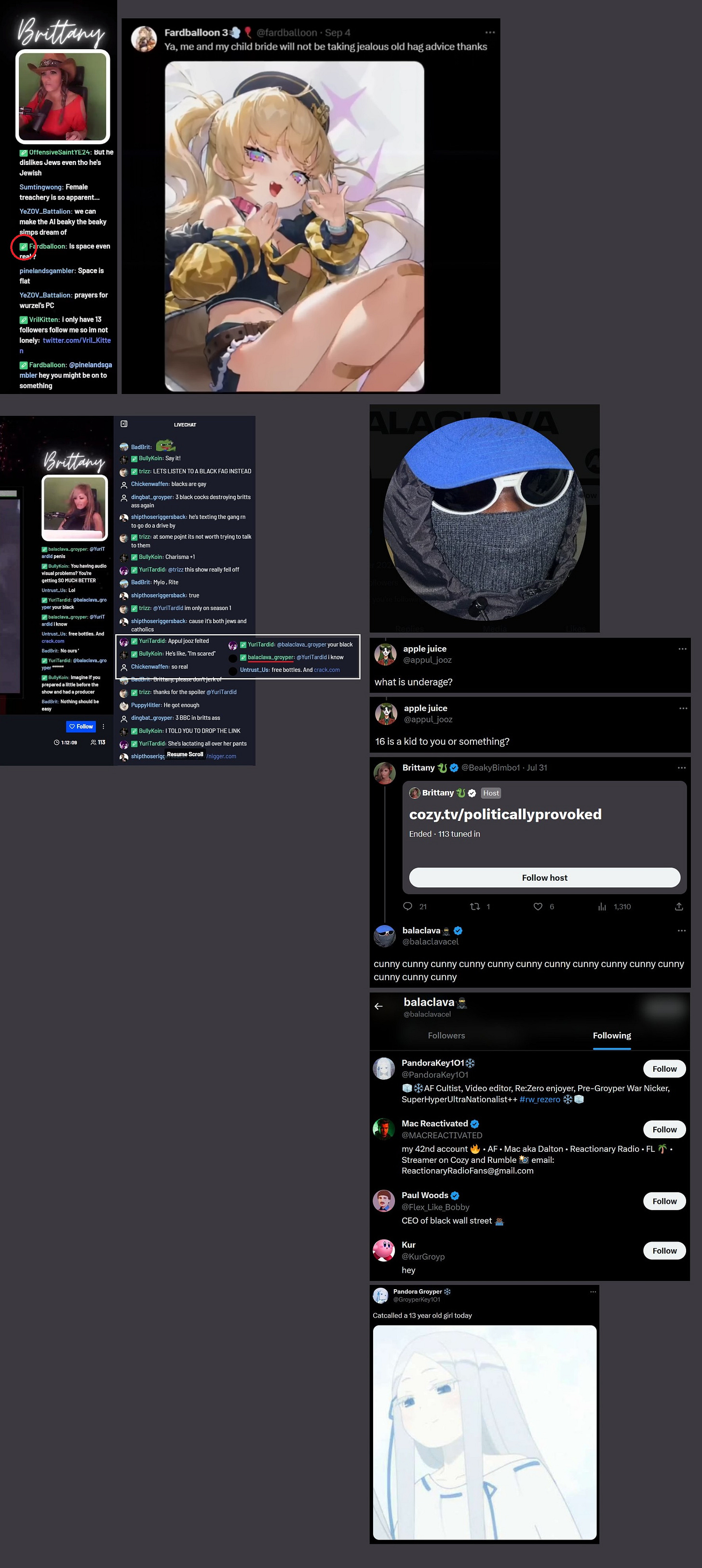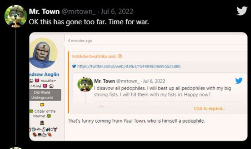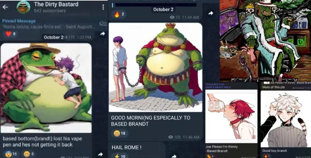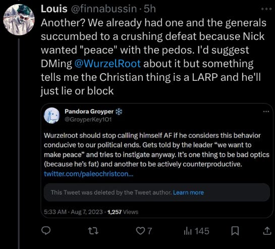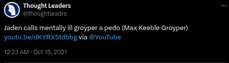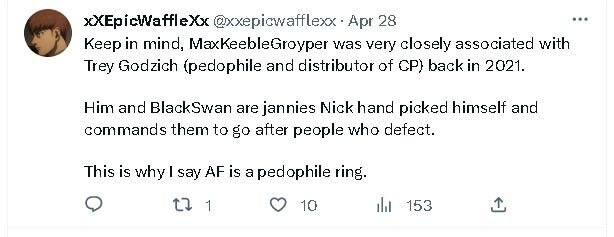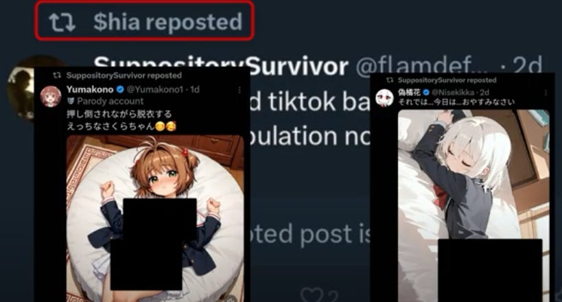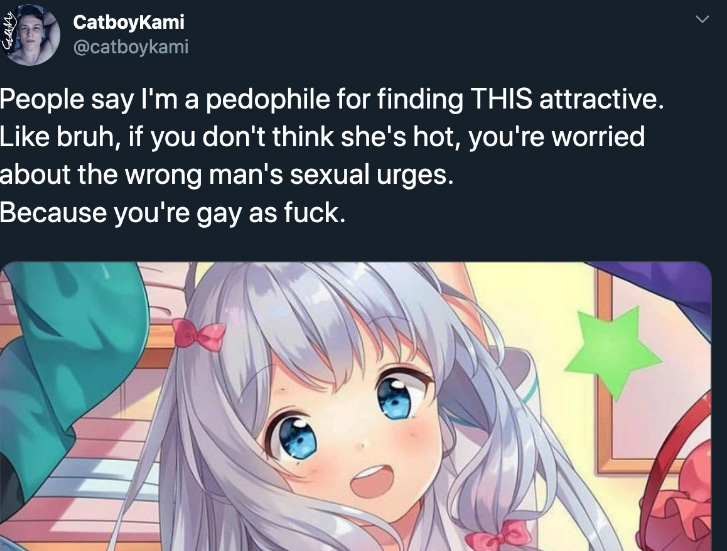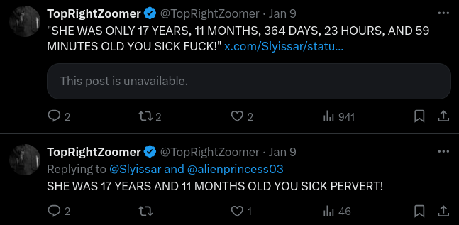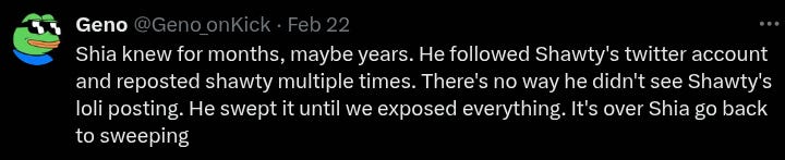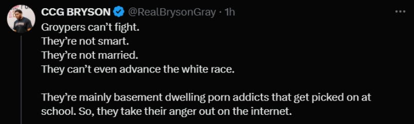‘‘Groyper pedo accounts are incredibly easy to find because they all like each other, follow each other, and promote each other. When they get banned for posting about lolicon and wanting to fuck kids, they make new accounts and re-tweet each other to retain their followers. That's why these accounts have hundreds of followers at a minimum and often 1000+. They are plugged into AF, they communicate on Telegram/Discord off-site, and promote each other.’’