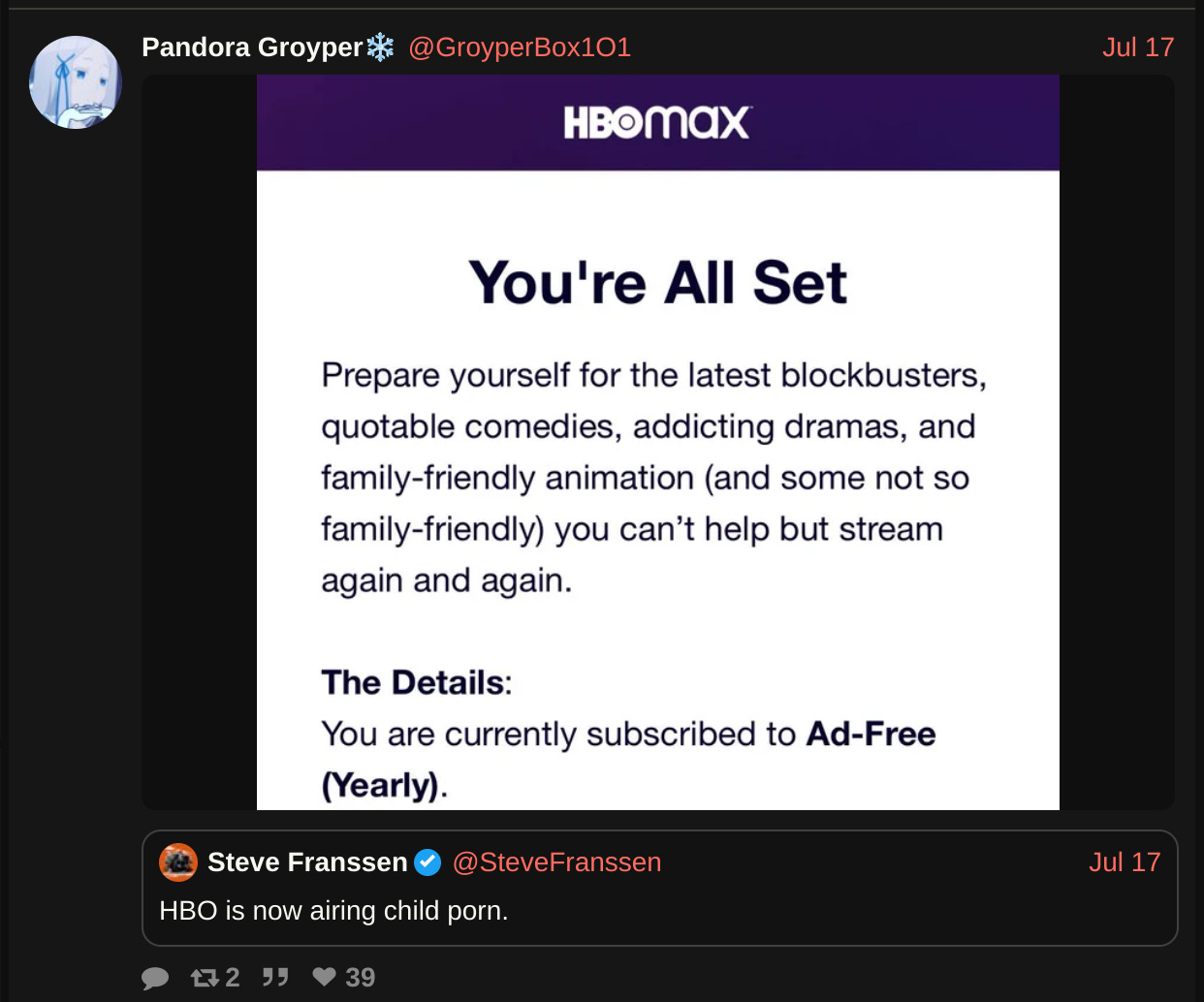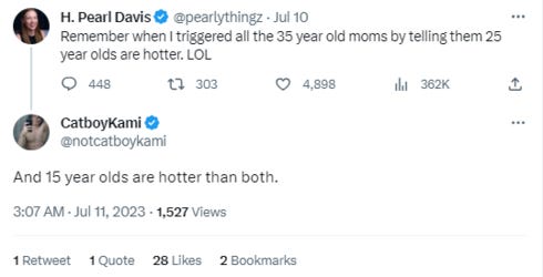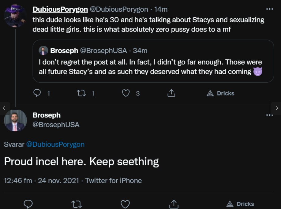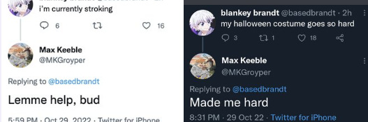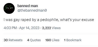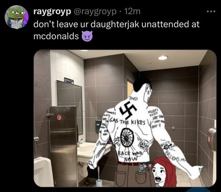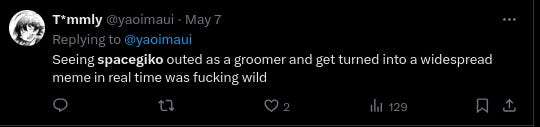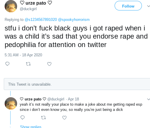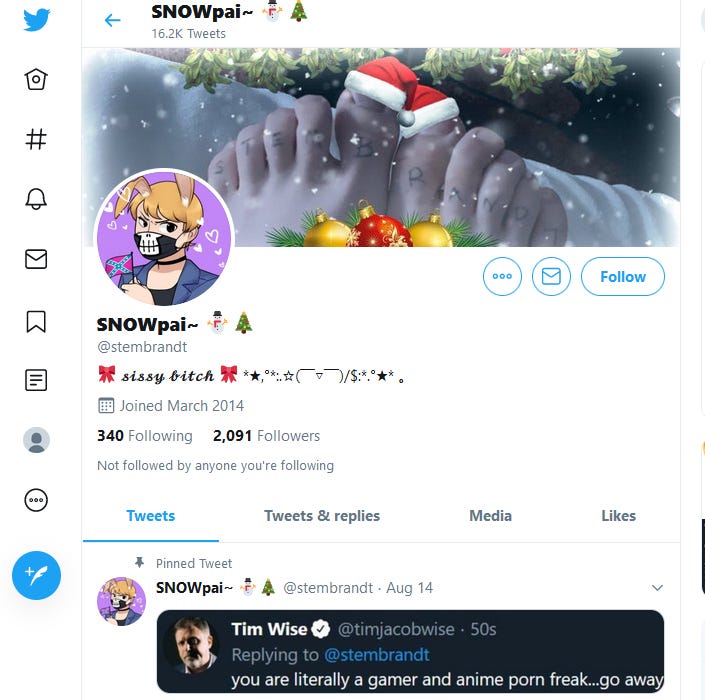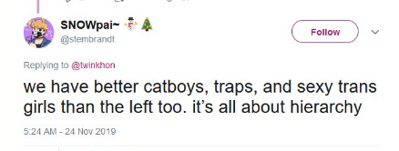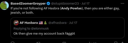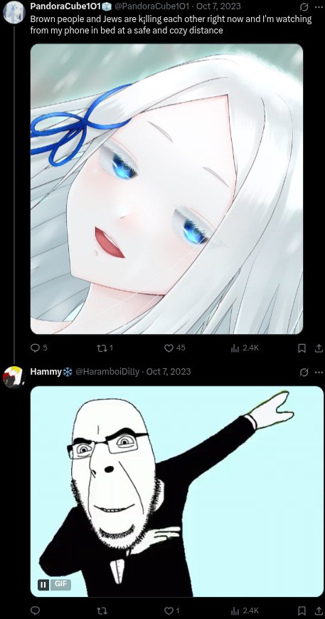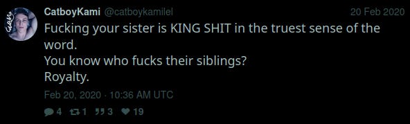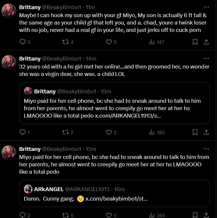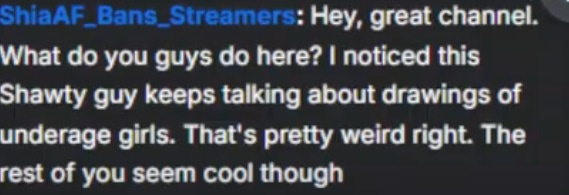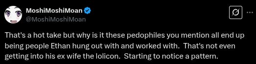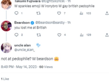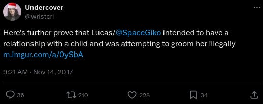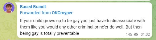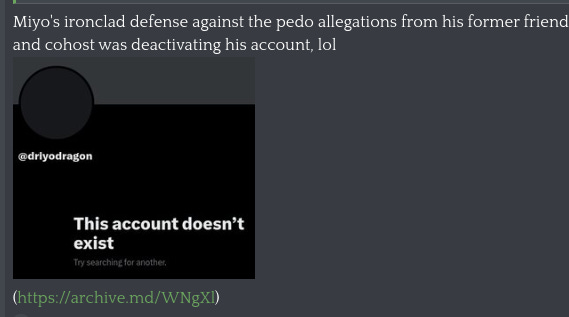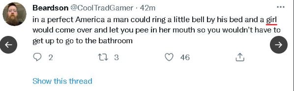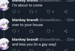 ‘‘Groyper pedo accounts are incredibly easy to find because they all like each other, follow each other, and promote each other. When they get banned for posting about lolicon and wanting to fuck kids, they make new accounts and re-tweet each other to retain their followers. That's why these accounts have hundreds of followers at a minimum and often 1000+. They are plugged into AF, they communicate on Telegram/Discord off-site, and promote each other.’’