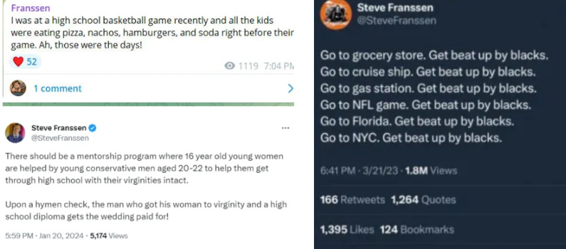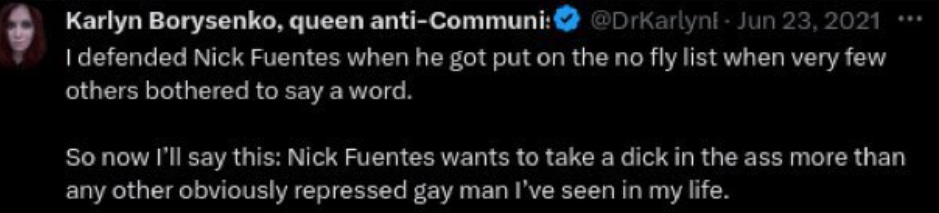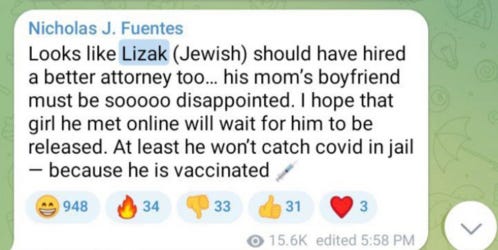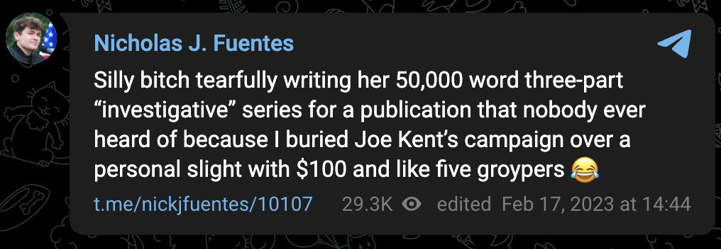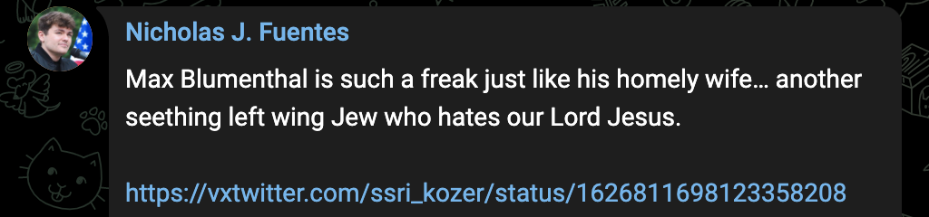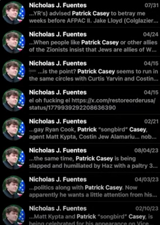 “You see why I am such a misogynist, you get an ignorant woman who is going to stick her little nose in there,” Fuentes fumed. “Fuck you, fuck your Jew husband, and his Sid Blumenthal Jew, Dem operative father, fuck you, you fucking cunt!’’
