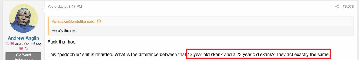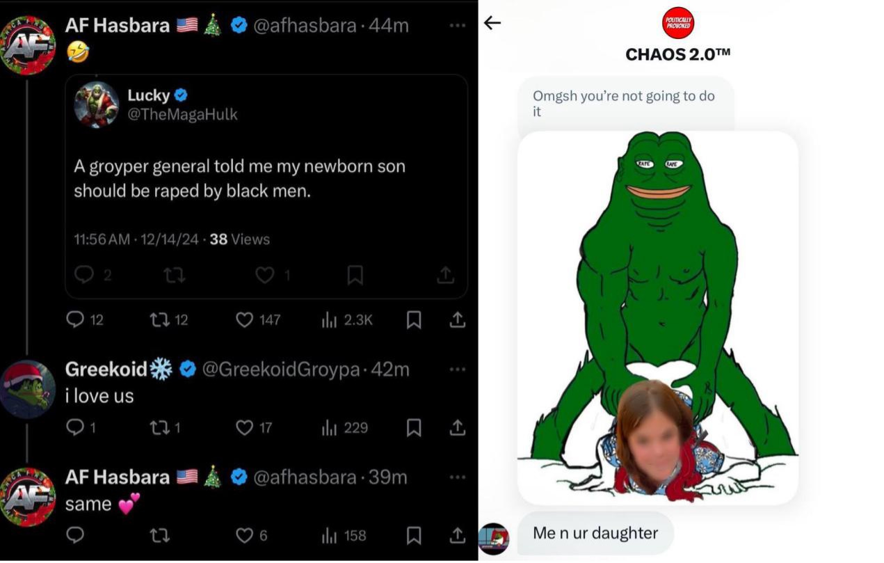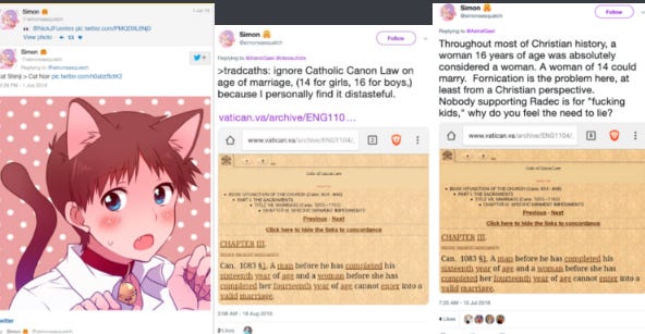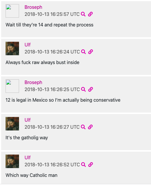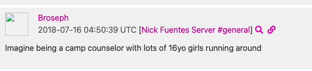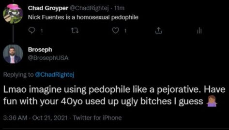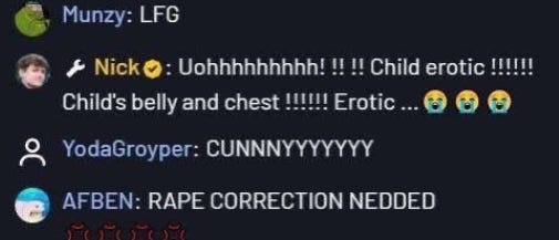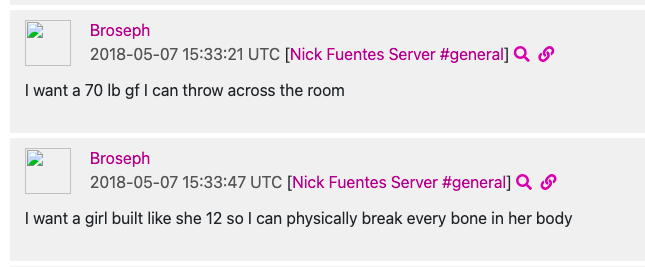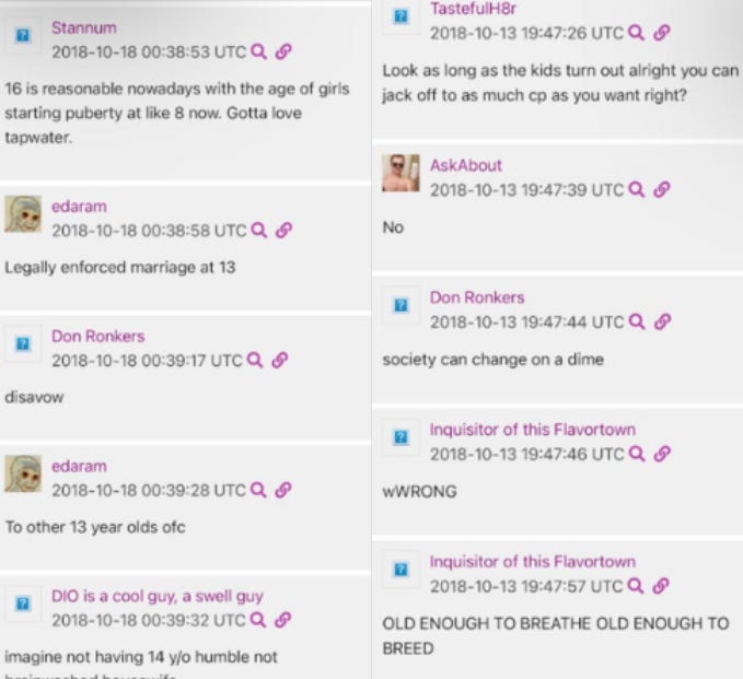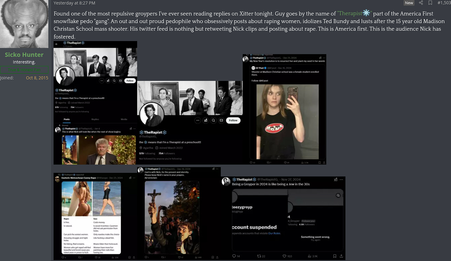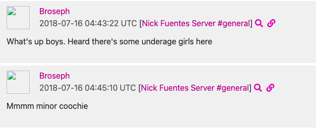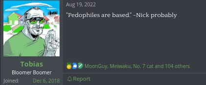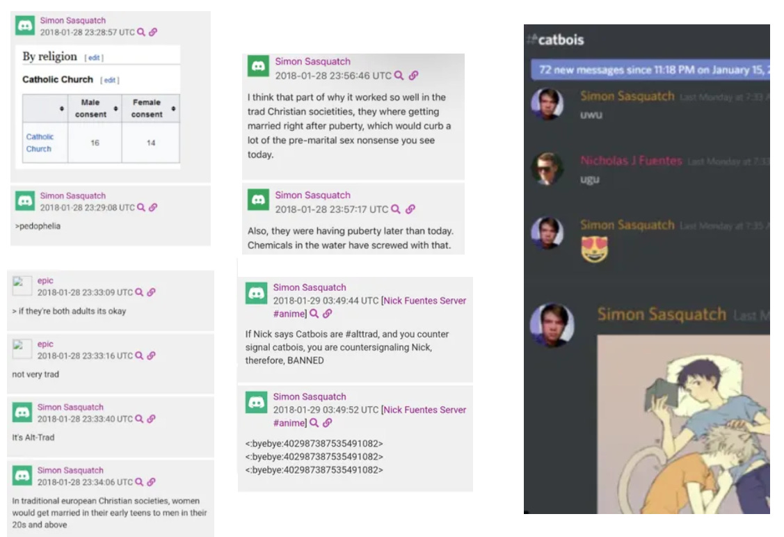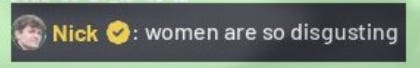 Nick’s followers, such as "Child Bride Groyper" mimic their leader and started posting about how ‘‘pedophilia is natural and normal … how old was Mary when God groyped her by the cunny?’’