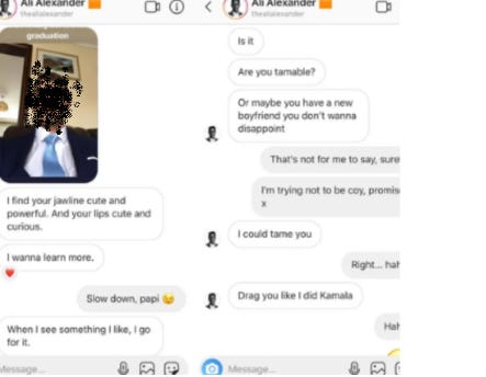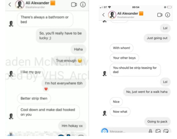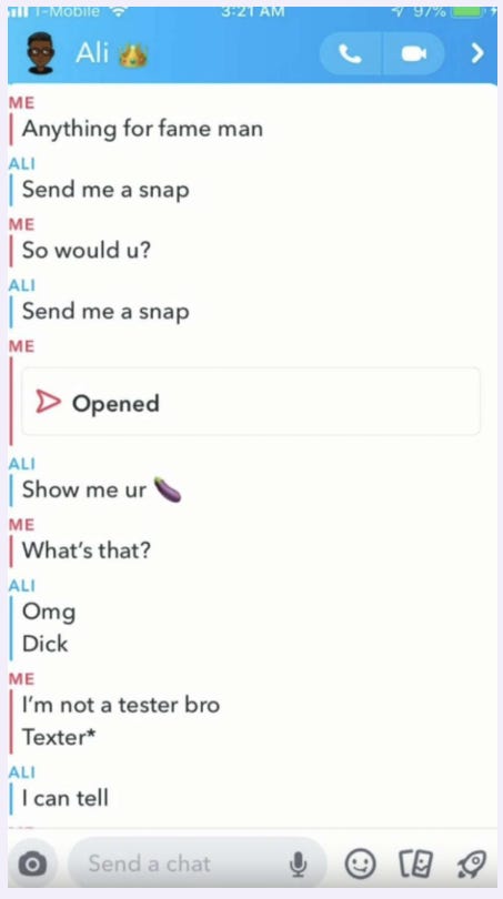 Here is Ali preying on another young boy on Instagram where he pesters him for selfies and tells the boy to ‘‘brush your teeth with my dick’’ before offering to fly him out in exchange for a blowjob.