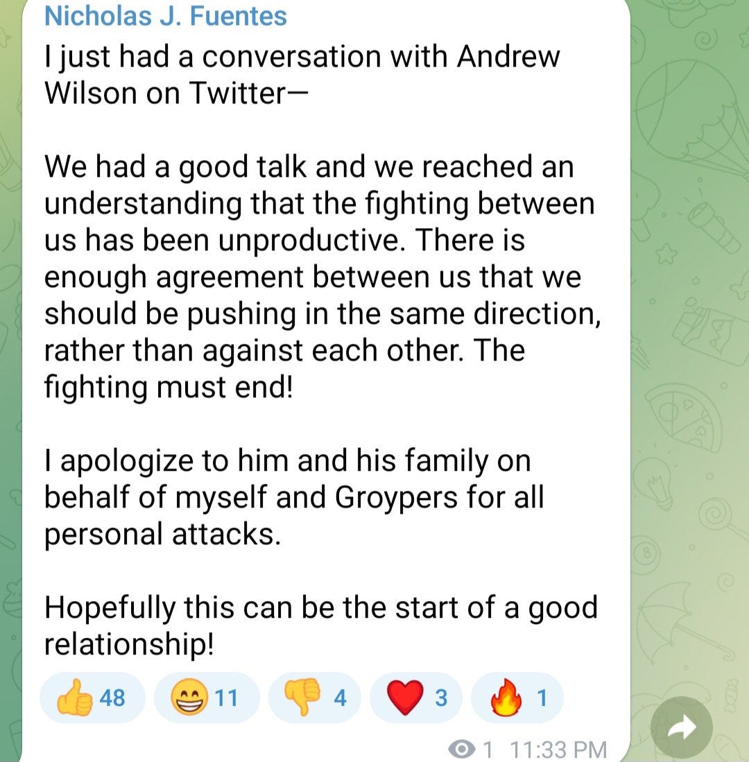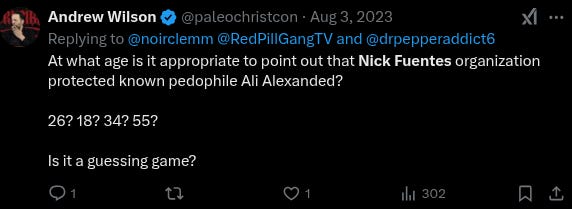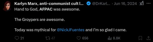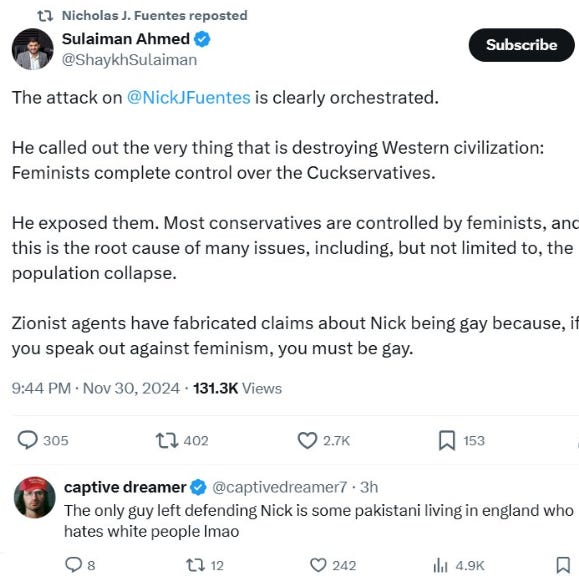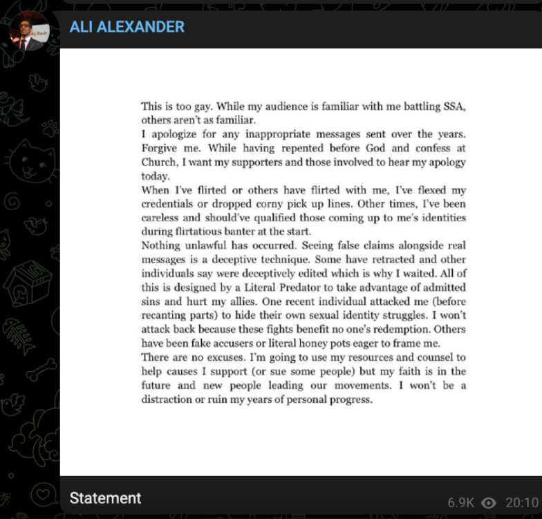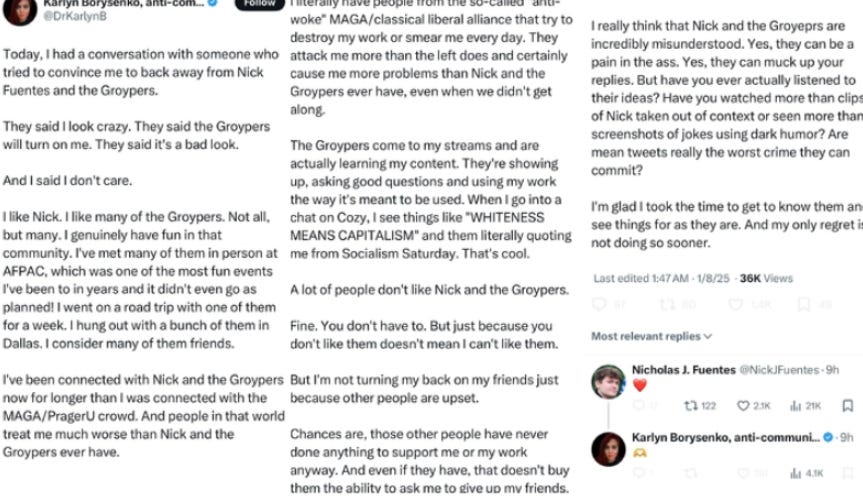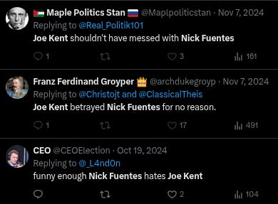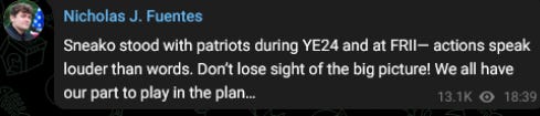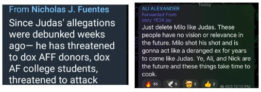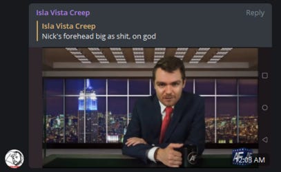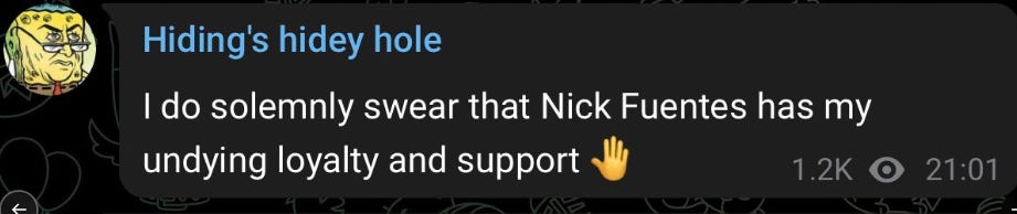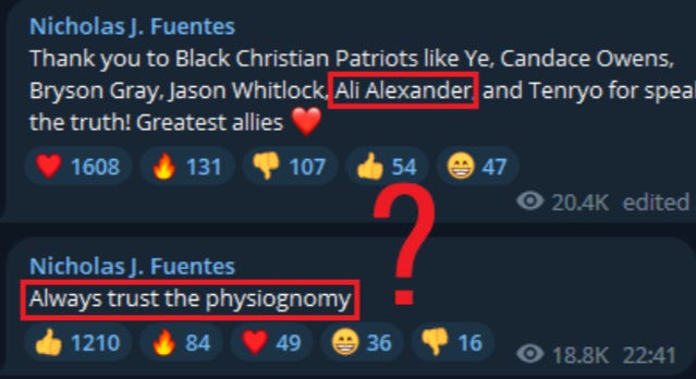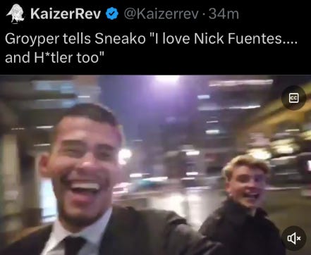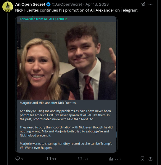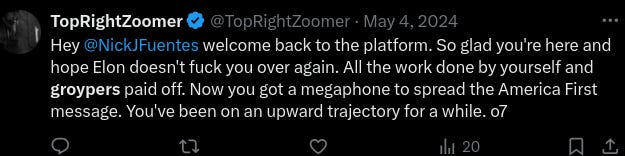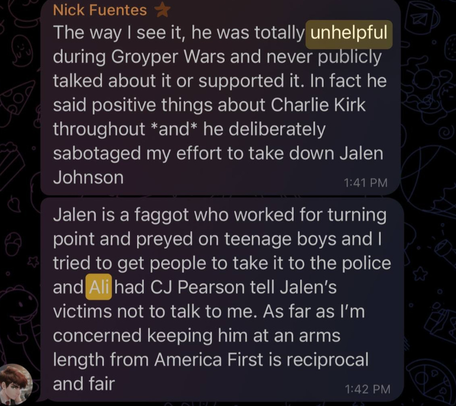 In 2024, after Nick’s X ban was lifted, Ali Alexander was spotted in the main Groyper group chats celebrating with them.