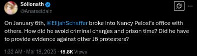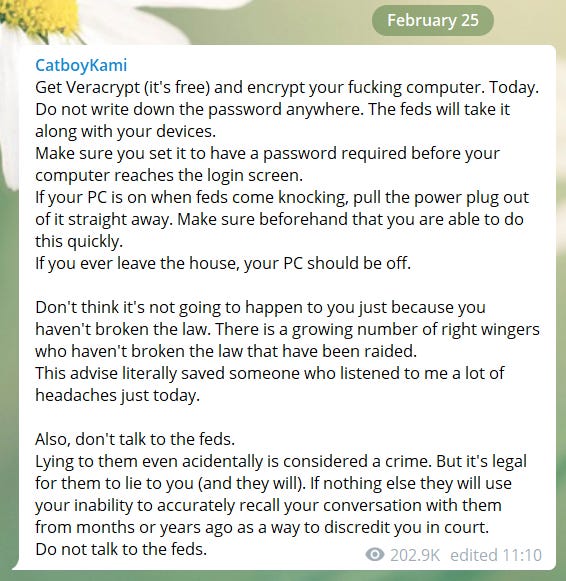 That’s why I absolutely fucking hate Nick Fuentes. Because in his audience, in his crowd of people, um, if you look at the videos of him walking around with a megaphone telling people to go into the Capitol building, they did. And they went to jail. They became felons. They went to prison for 6 months. I think some of them are still in jail, depending on what they did, um, ‘cause a lot of those people got very heavy sentences for multiple years. And the only person of that crowd of hundreds of people—‘cause the federal government was so bloodthirsty after January 6 because they had to show that there is no safety in numbers—you can show up in the thousands, you can coordinate an attack on the federal government in the thousands, and they will systematically, for years after the fact, hunt you down, post pictures on social media, encourage people to rat out their own families. They’ll find you. They’ll drag you to D.C. in handcuffs. They’ll extradite you from whatever fucking corner of the country you’re in. They’ll put you on charges. They’ll give you a felony. They’ll put you in jail for 6 months. It doesn’t matter who you are or where you’re at. If you did something to displease the federal government, they were going to come after you. And they went after everybody. And of all the people who were there, of all the people who incited a riot or whatever the fuck charge they got, the one that walked away from it was the guy with the megaphone telling people—his own followers—to go into the Capitol building. That was the guy who caught no charges and is free to walk around. I don’t believe it. … I don’t believe it for a second. He flipped. He turned, and he takes marching orders from the government now.