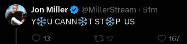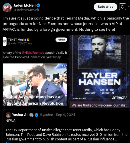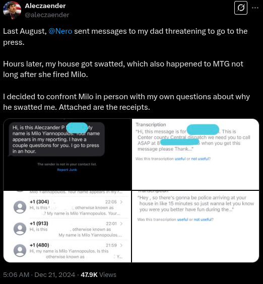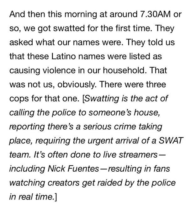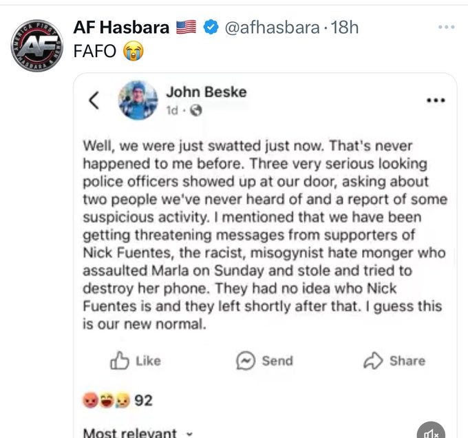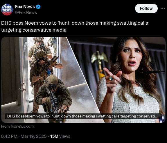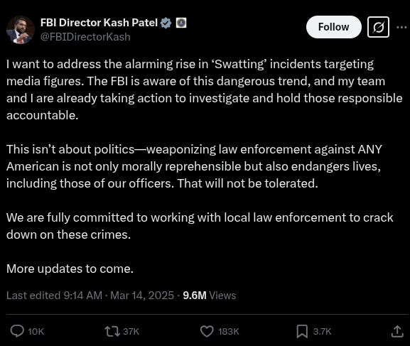 Swatting, when systematically weaponized like this to advance Nick’s political agenda, constitutes domestic terrorism. This week, both DHS Secretary Kristi Noem and FBI Director Kash Patel launched anti-swatting campaigns.
