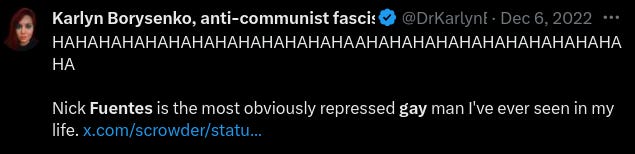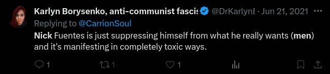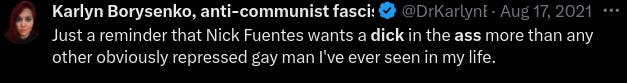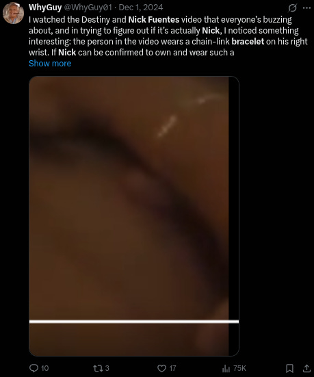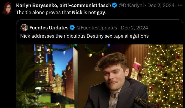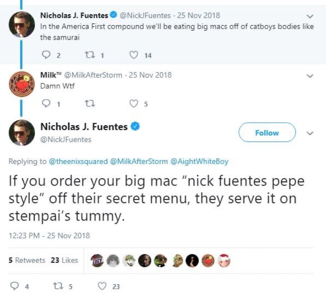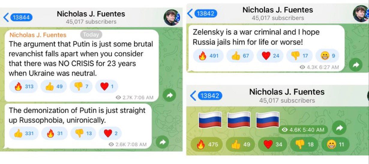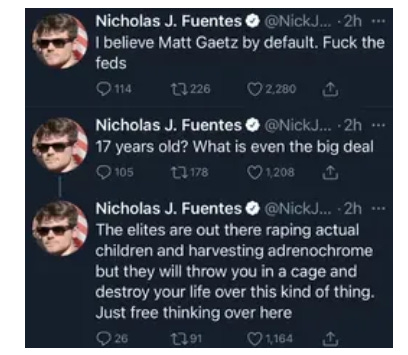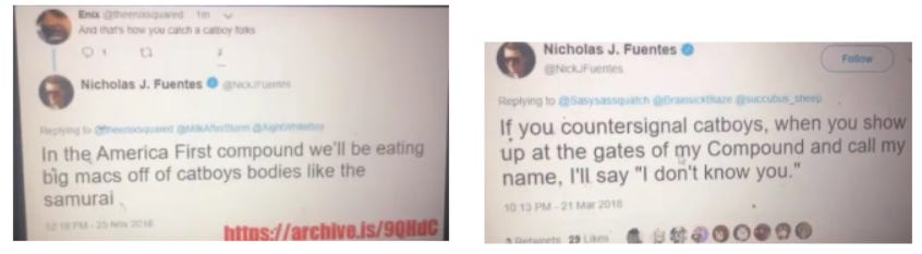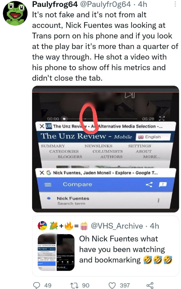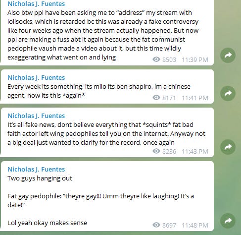 ‘‘Nick Fuentes should respect this investigation a little bit more than he has, because it could have gone in a totally different direction … [Nick was] fantasizing about being in a gay club … All [Nick Fuentes] does is talk about anal sex, he’s obsessed with anal sex … we didn’t [write] anything on his catboy fetish, we didn’t [write] anything on Nick Fuentes and the catboys, you can look that up yourself, it’s all there for everybody to see, Nick Fuentes and catboys … The Grayzone doesn’t fuck around, the receipts are there.’’