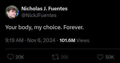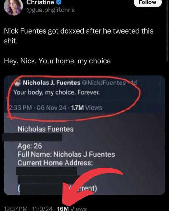 It is not without irony, then, that Nick became the target of a doxxing campaign in November 2024 after tweeting a viral rape/abortion joke, "Your body, my choice," which amassed 101.6 million views. Liberals retaliated by doxxing his home address in Chicago, with one dox gaining 16 million views, ‘‘Your home, my choice.’’