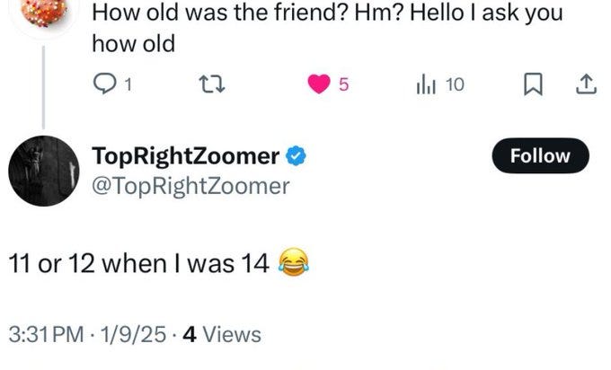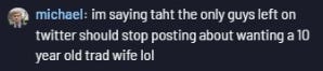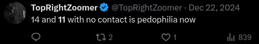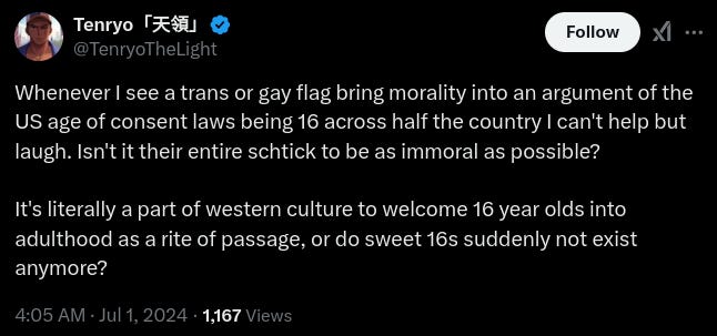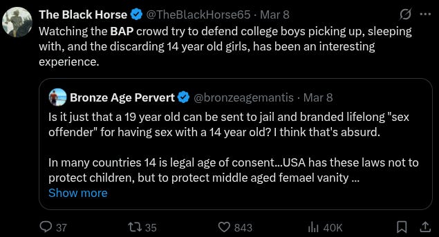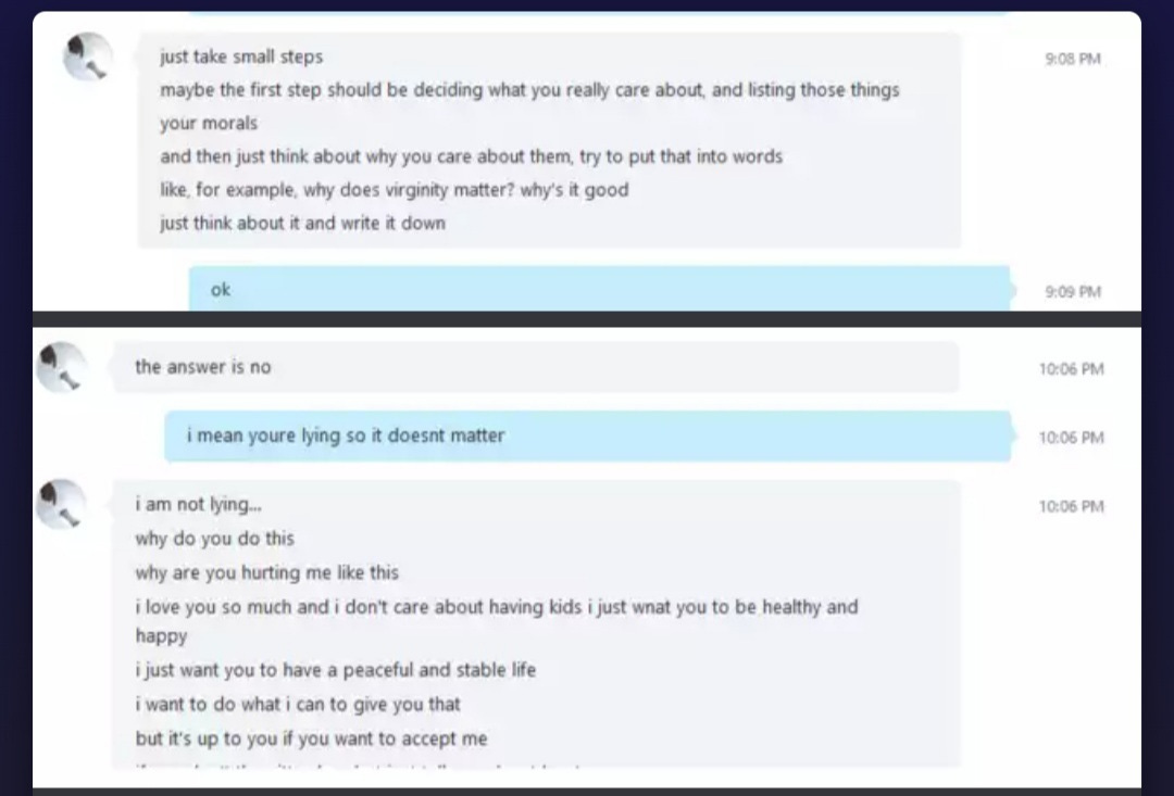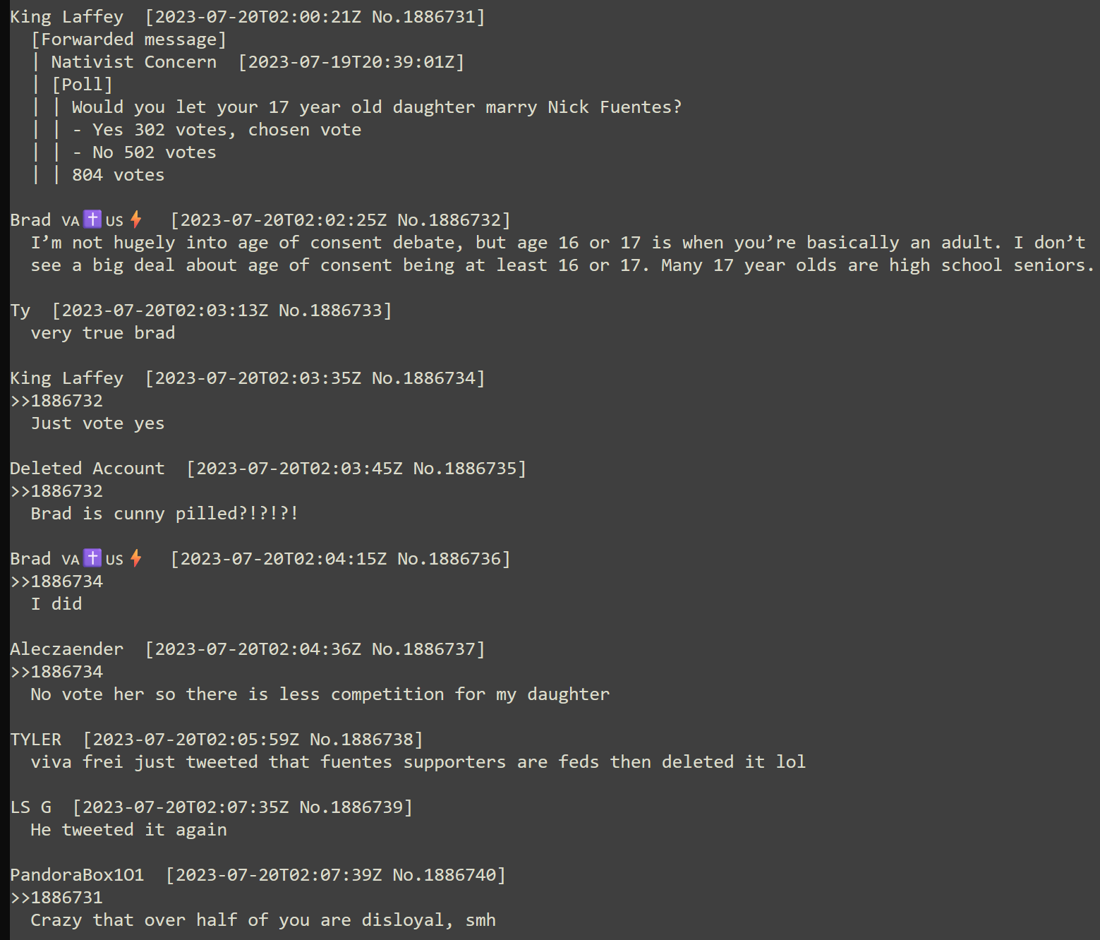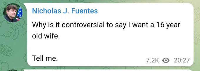 Zach’s views on relationships and morality became more disturbing the longer I knew him. He openly expressed support for lowering the age of consent. He claimed that a 30-year-old man marrying a 15 or 16-year-old girl was not only acceptable but ideal, something Nick Fuentes has stated on his stream. He ignored the Church's current teachings on the importance of maturity, dignity, and mutual respect in relationships. The desire to groom young girls under the guise of tradition revealed his lack of genuine faith and respect for human dignity.