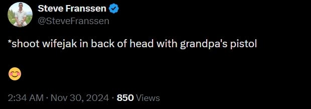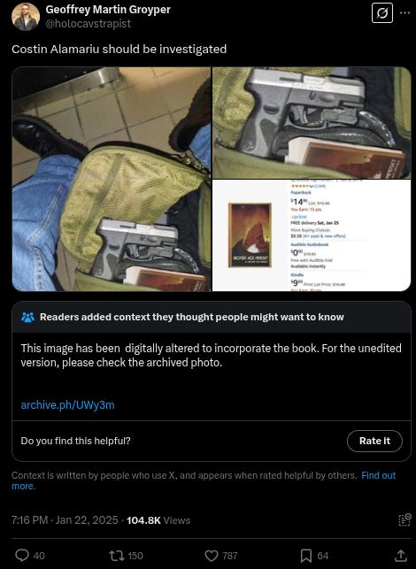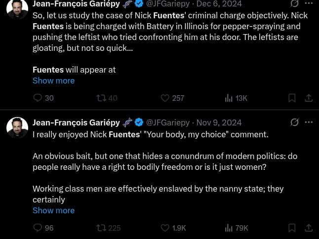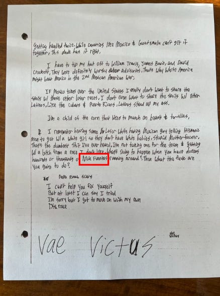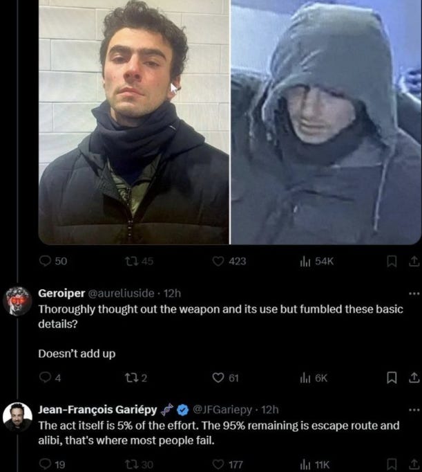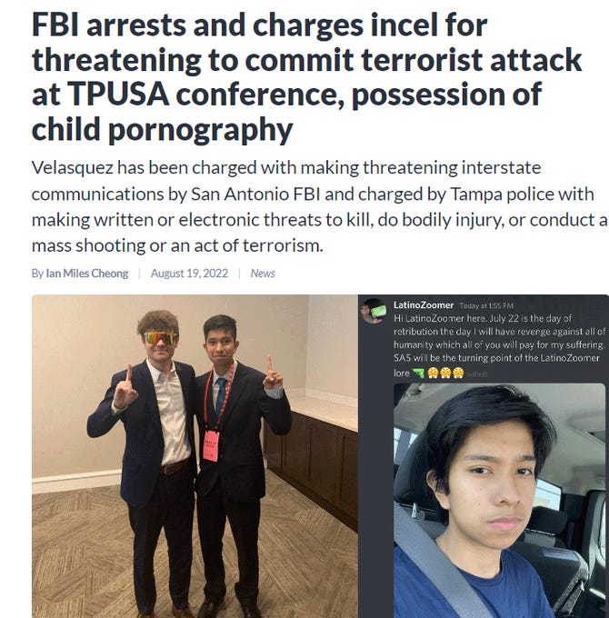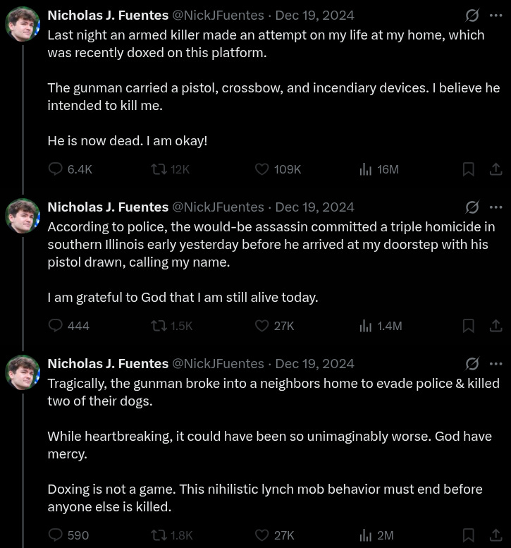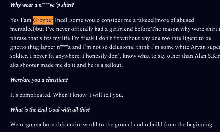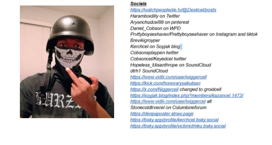 After being thwarted by Nick’s locked front door (and banging on his side door)—which is ironic, because ‘‘The Second Groyper Mass Shooter’’ (#6 on this list) dedicated an entire portion of his manifesto to explaining that many mass shooters get stopped by locked doors, so he planned ahead by preparing a lock-picking kit—Nick’s would-be assassin ran to his next-door neighbor’s house, where he killed their two dogs, shot at his neighbor’s son, before being killed by the police.