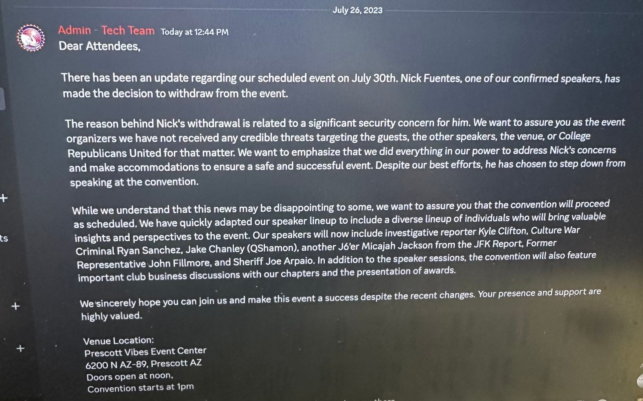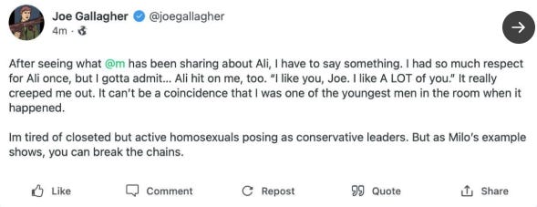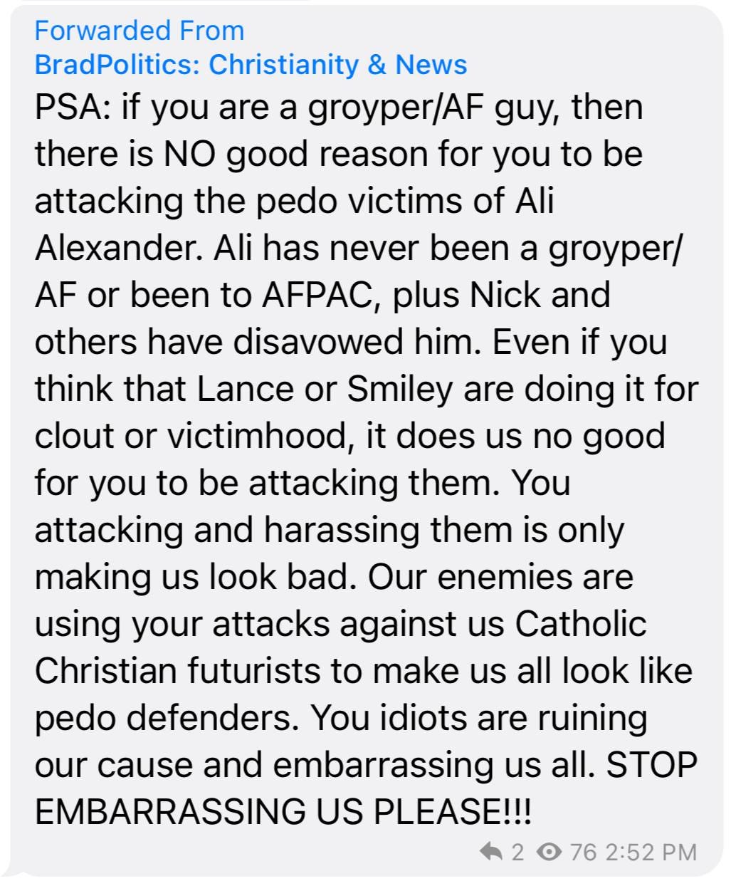 Years later, CJ Pearson became National Co-Chair of the Republican Youth Advisory Council. In a leaked “Groyper Generals” group chat, Nick Fuentes claimed Pearson collaborated with Ali to cover up another pedophile scandal within the Groyper ranks.