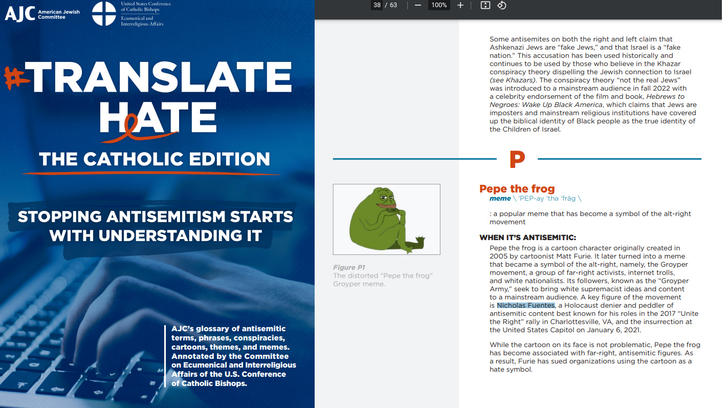In December 2024, the United States Conference of Catholic Bishops (USCCB), an assembly of all active and retired American bishops, released a 63-page document titled “Translate Hate: The Catholic Edition,” which made a splash because this marks the first time the Catholic Church has disavowed Nick Fuentes by name.