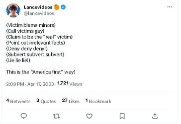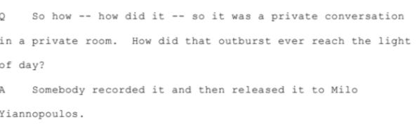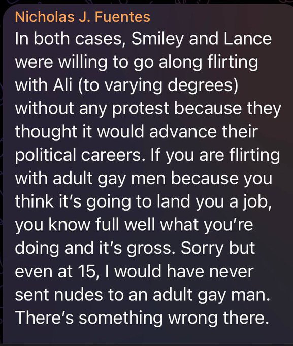 ‘‘I stand by what I’ve said about Smiley and Lance, with regard to Smiley and Lance, I think that in both cases, they know what they are doing … there’s a culture within the right wing where, if we’re all being honest, everyone knows what they’re doing … Lance is trading his sexuality for a political favor … People are using their position and status for sexual favors … they are using their sexuality to try to get a leg up profesionaly, At 15, 16, 17, I think you know what you are doing.’’