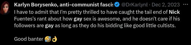 ‘‘I don't care how gay my supporters are. As long as they are my loyal cult members and dox [my enemies] when I give the command, as long as my gay followers are unquestionably loyal cultists who will give me money and dox [my enemies].’’