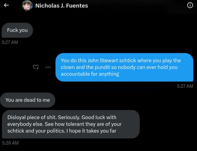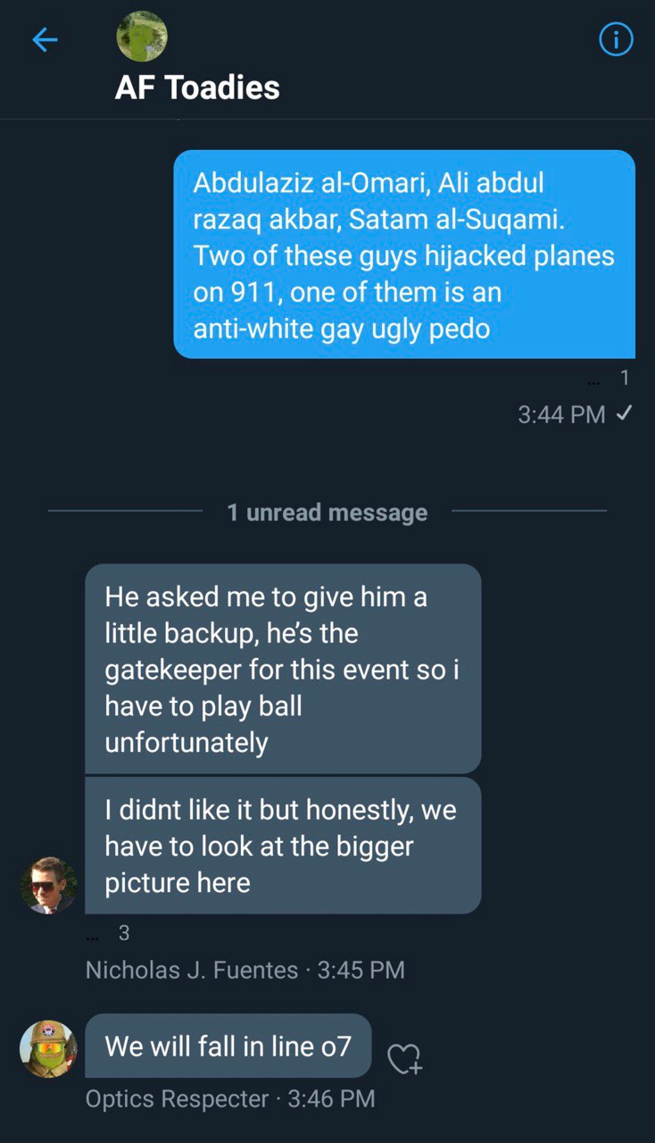 Nick Fuentes: ‘‘Why don’t you let me worry about that? Last I checked, you aren’t the one leading anything ... why don’t you trust my judgment?’’