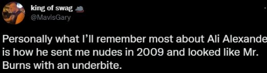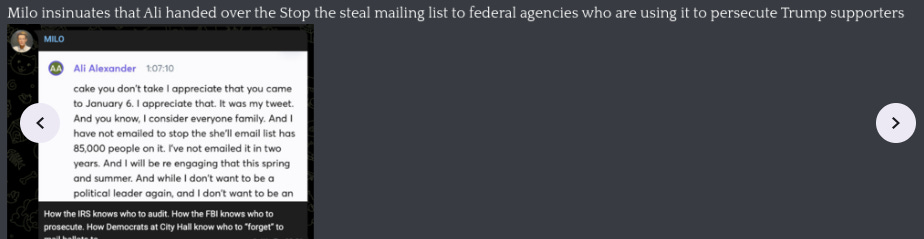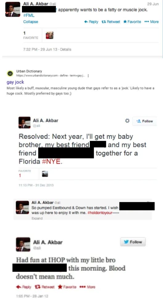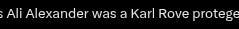 "[Ali] did things with Karl Rove, he pretends to be in the right wing … I have evidence that Ali is literally gay for the alt-right, confirmed by several sources. … There's, like, abundant evidence that ... [Ali Alexander] would like interact in a sexual way with young [fascist] white boys ... I knew Ali was bisexual. Ali flirted with me when I was 19. or 20."