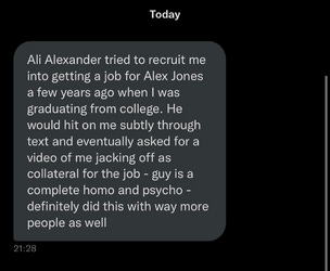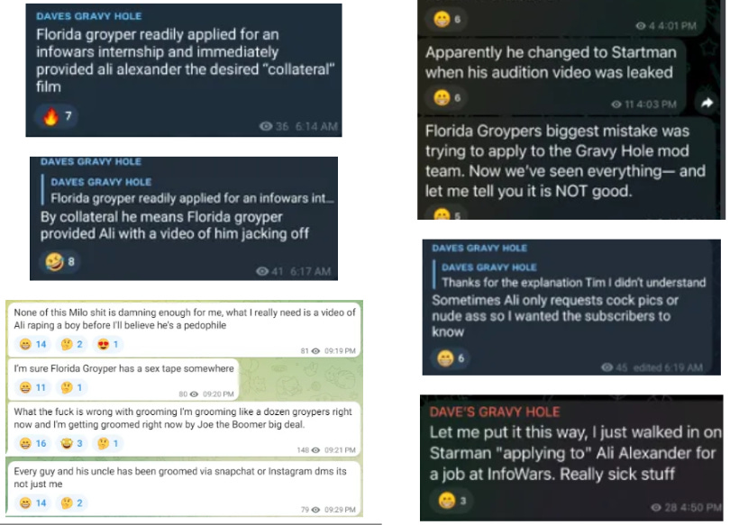 Ali also asked ‘‘Florida Groyper’’ to provide him with ‘‘a video of him jacking off’’ as ‘‘collateral’’ if he wanted an ‘‘Infowars internship.’’
