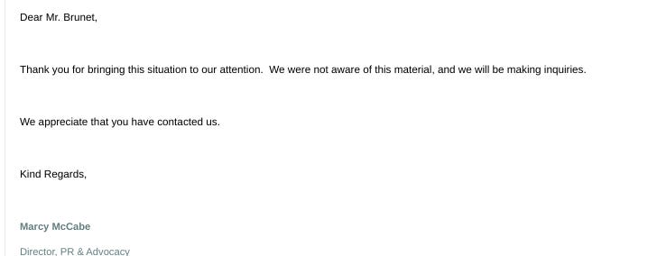 Chris Brunet: I am reaching out to you at this stage to see if you wanted to add any input to the article, perhaps \write a paragraph and give me a quote on Nick being disavowed by the USCCB, I would be extremely grateful for your participation