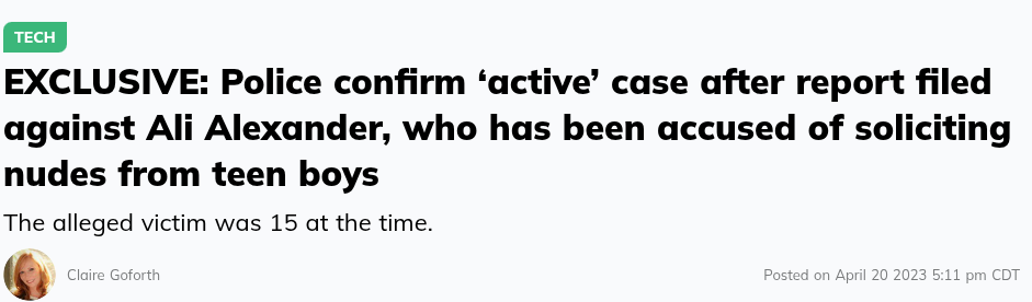 ‘‘The [Ali Alexander] investigation is still active … I spoke to Chief Strossner and he said we do have an open investigation but not enough to file criminal charges at this time. We are trying to collaborate with the Fort Worth Internet Crimes Against Children Unit. If you have any information that would help further our investigation here in Johnstown, we would be interested in having a detective meet with you.''