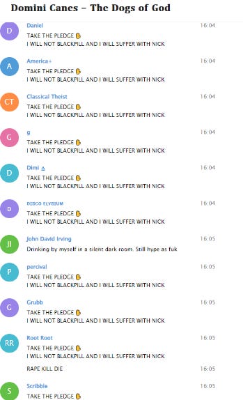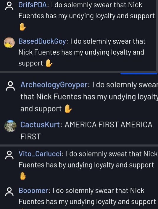 "Take the loyalty pledge. I will kill, rape, and die for Nick Fuentes. Raise your right hand. Everybody raise your right hand. Raise your right hand, repeat after me: I will kill, rape, and die, for Nicholas J Fuentes."