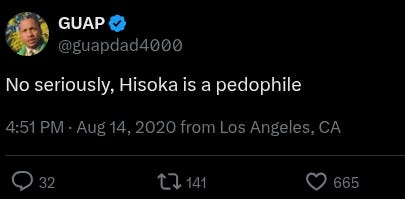 ‘‘Asuka’’ is a 14-year-old girl from Neon Genesis Evangelion, and is famous among pedophiles for her youthful appearance and vulnerability. “Hisoka” is another popular anime character among Groypers.