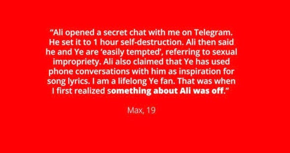 In another case, Ali dangled his Kanye connection to lure in Max, a 19-year-old "lifelong Kanye West fan.’’ Ali pressured Max to send him compromising pictures and pushed to meet for sex.