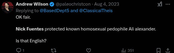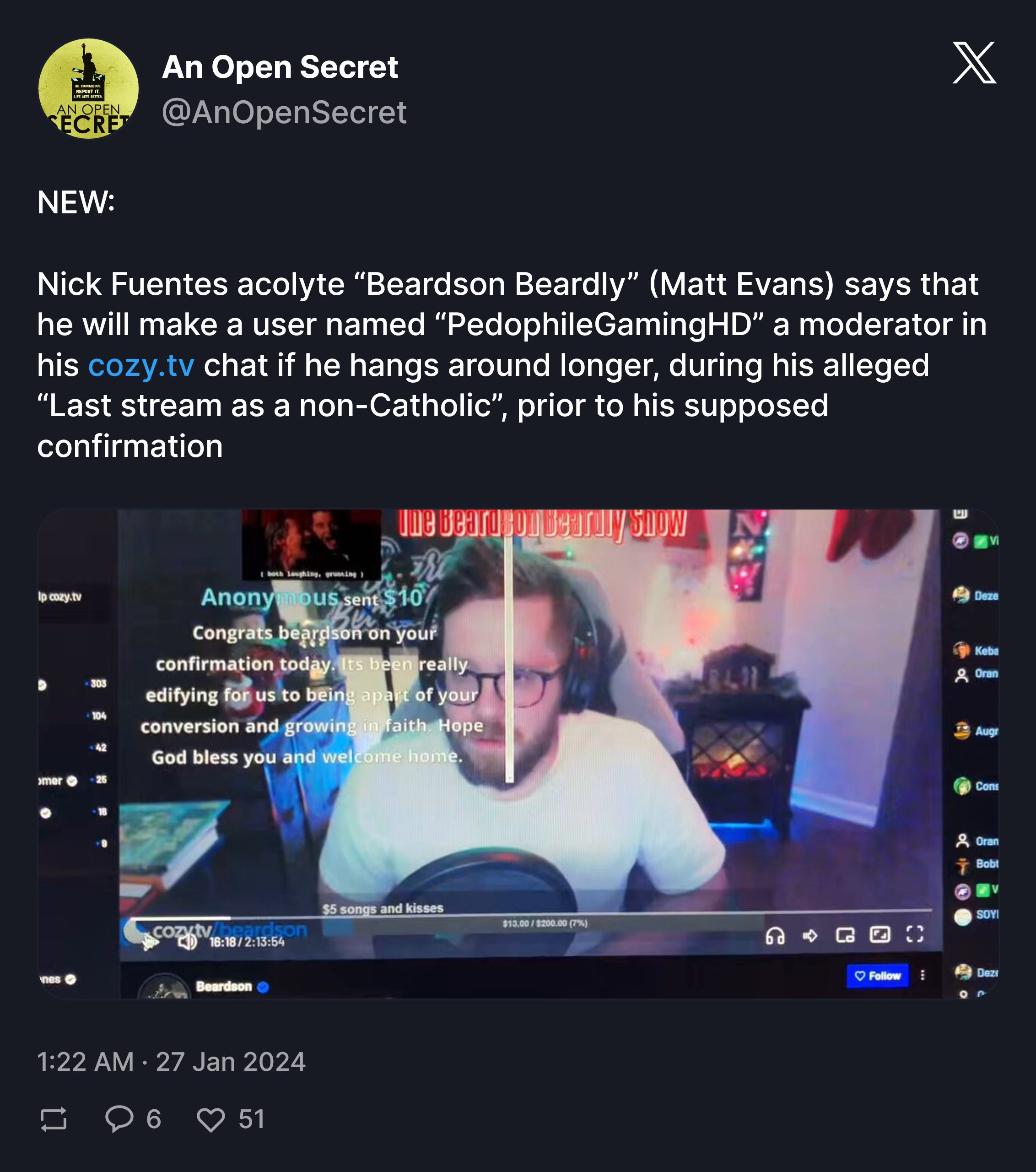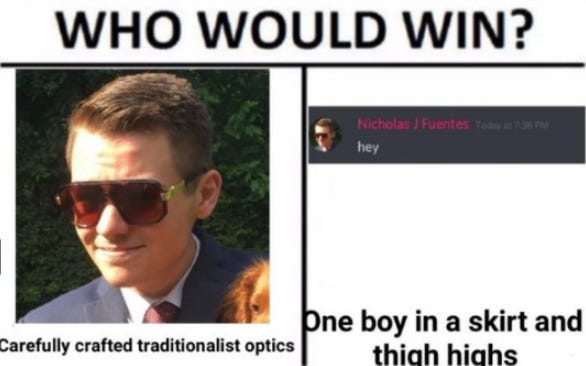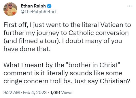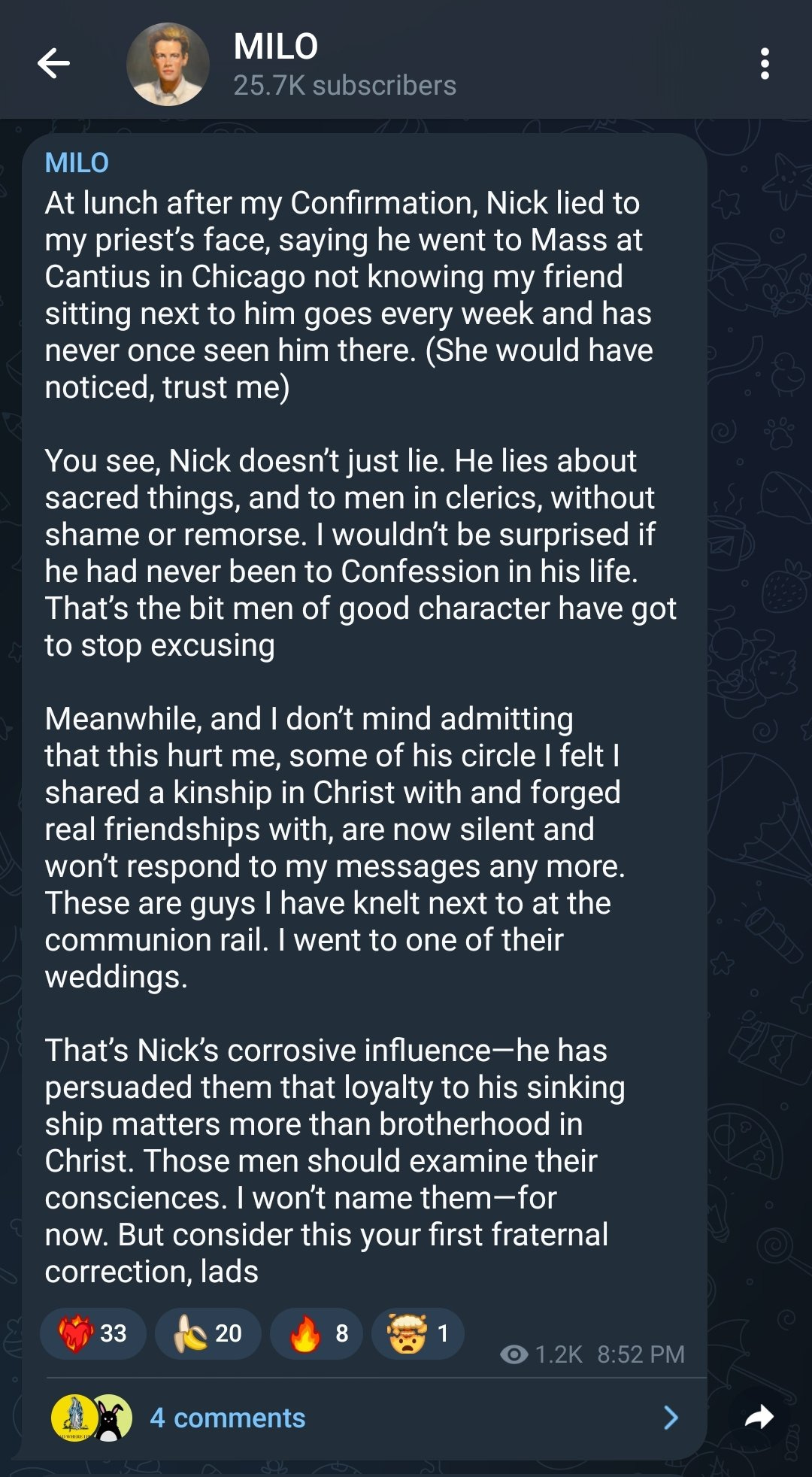 There was not a single time he had even gone to Mass with me. He was an ex-protestant convert but wasn’t in the process of taking RCIA classes. I wondered if he only converted because it was “based” and Nick Fuentes was catholic, not necessarily a calling to the church.