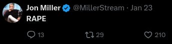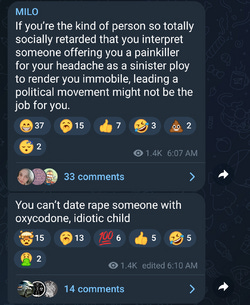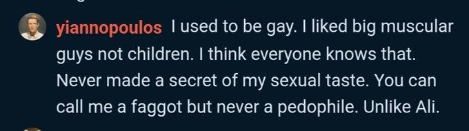 Viewer: ‘‘I think distancing ourselves from that brown pederast is the best thing for America First. We only need you. Milo and Ali prove it’s no good to associate with former homosexuals.’’